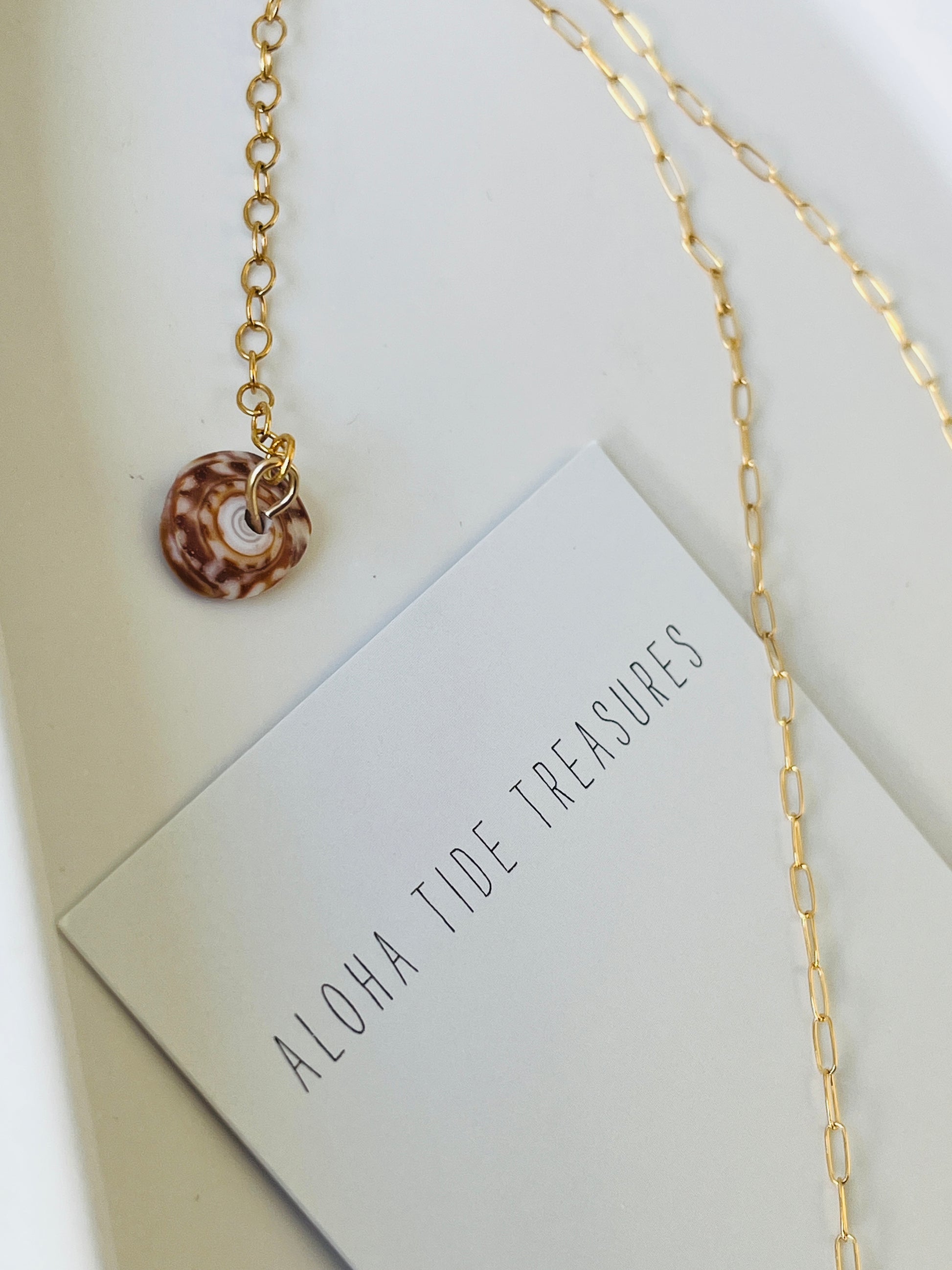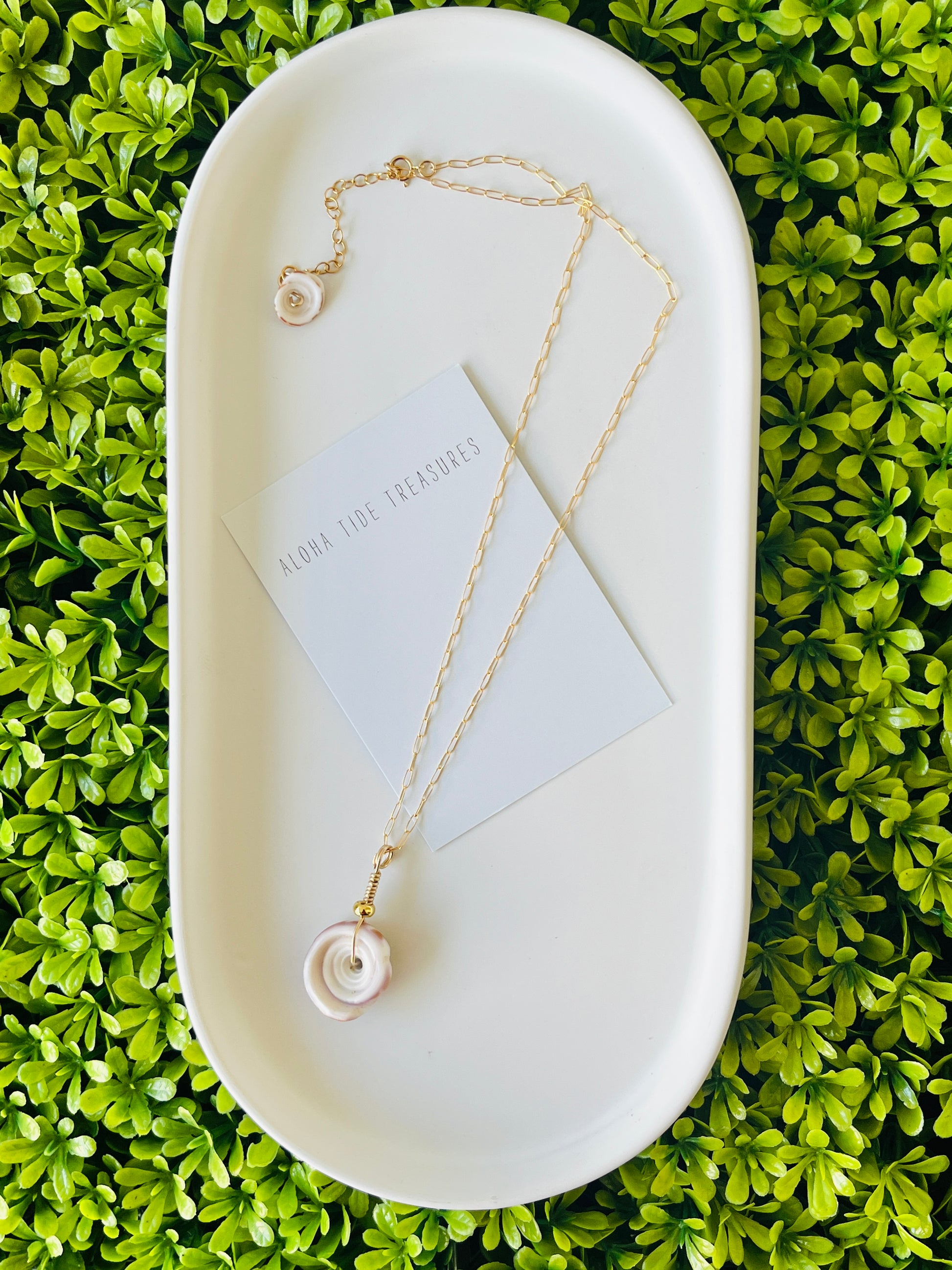 Locally found beautiful Puka Shell hung from 14K Gold Filled Chain and wire measuring 16 inches with adjustable chain.