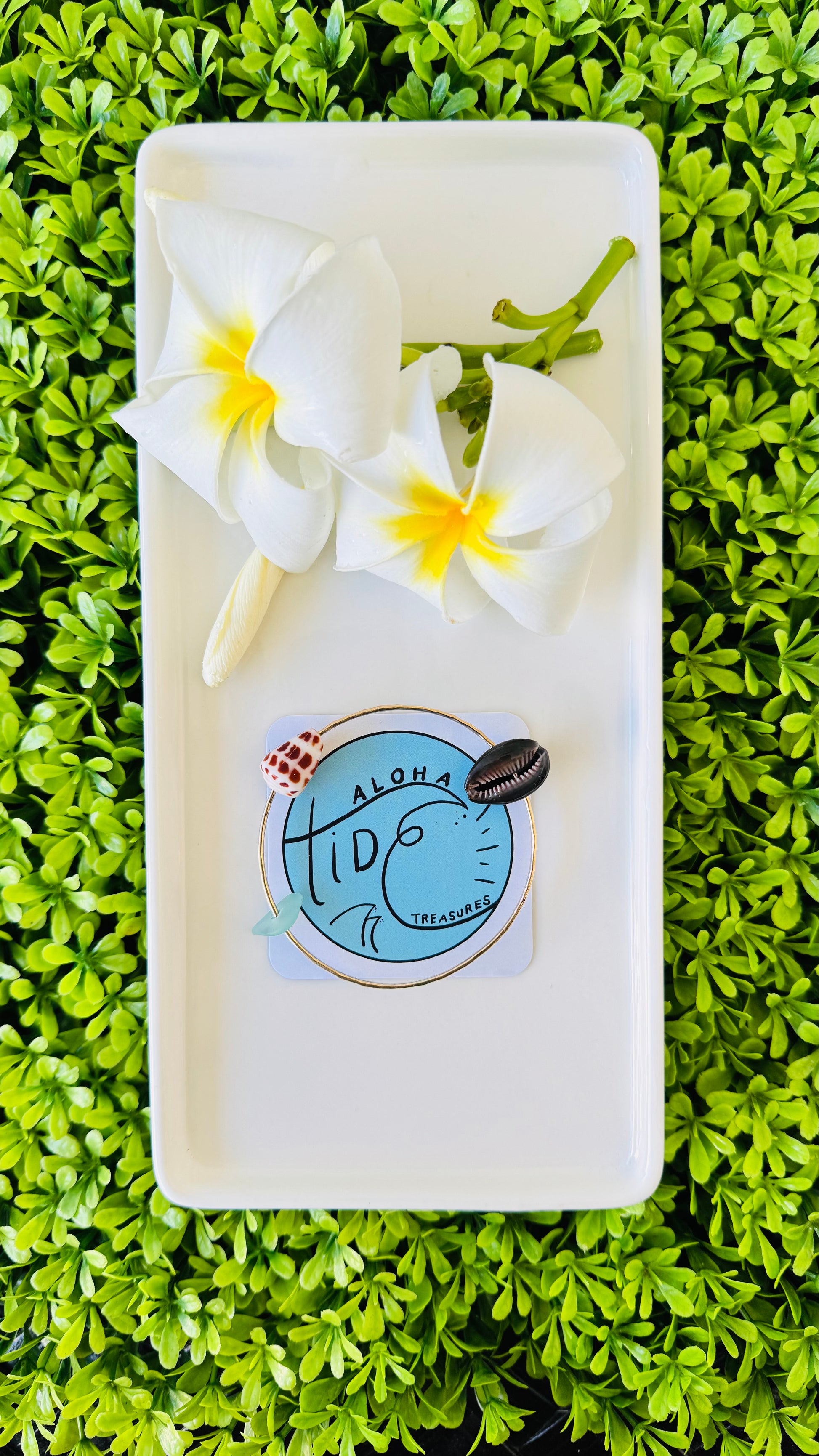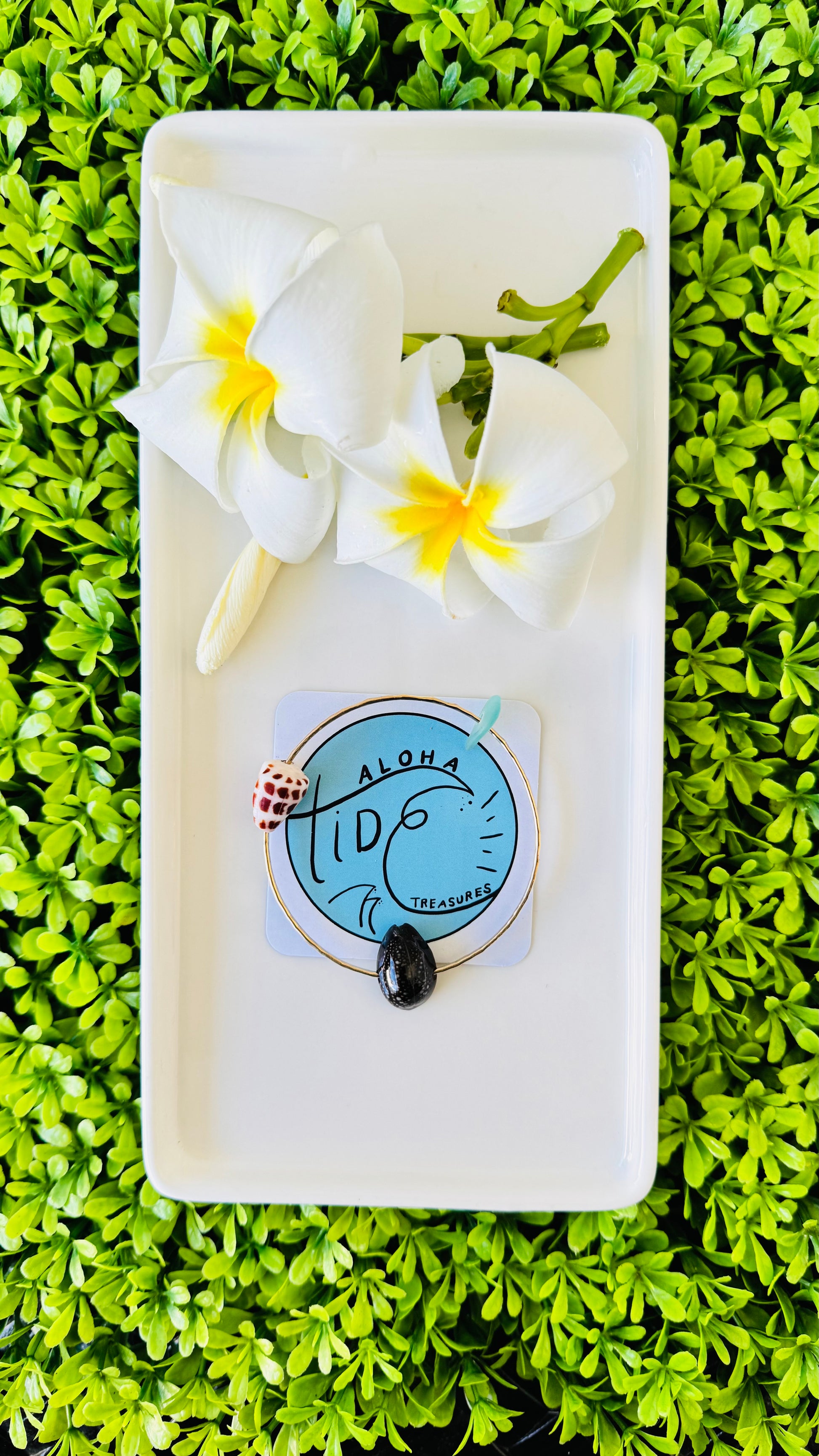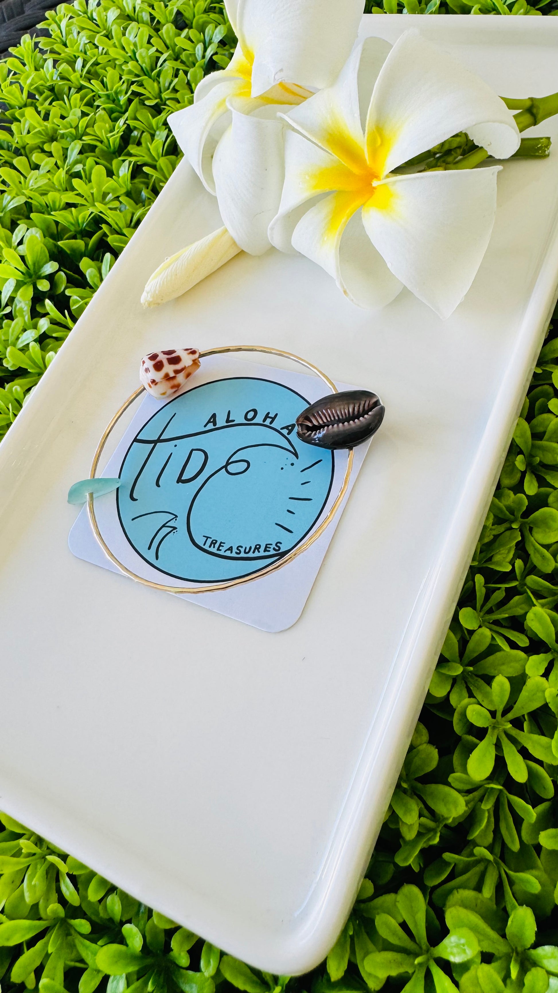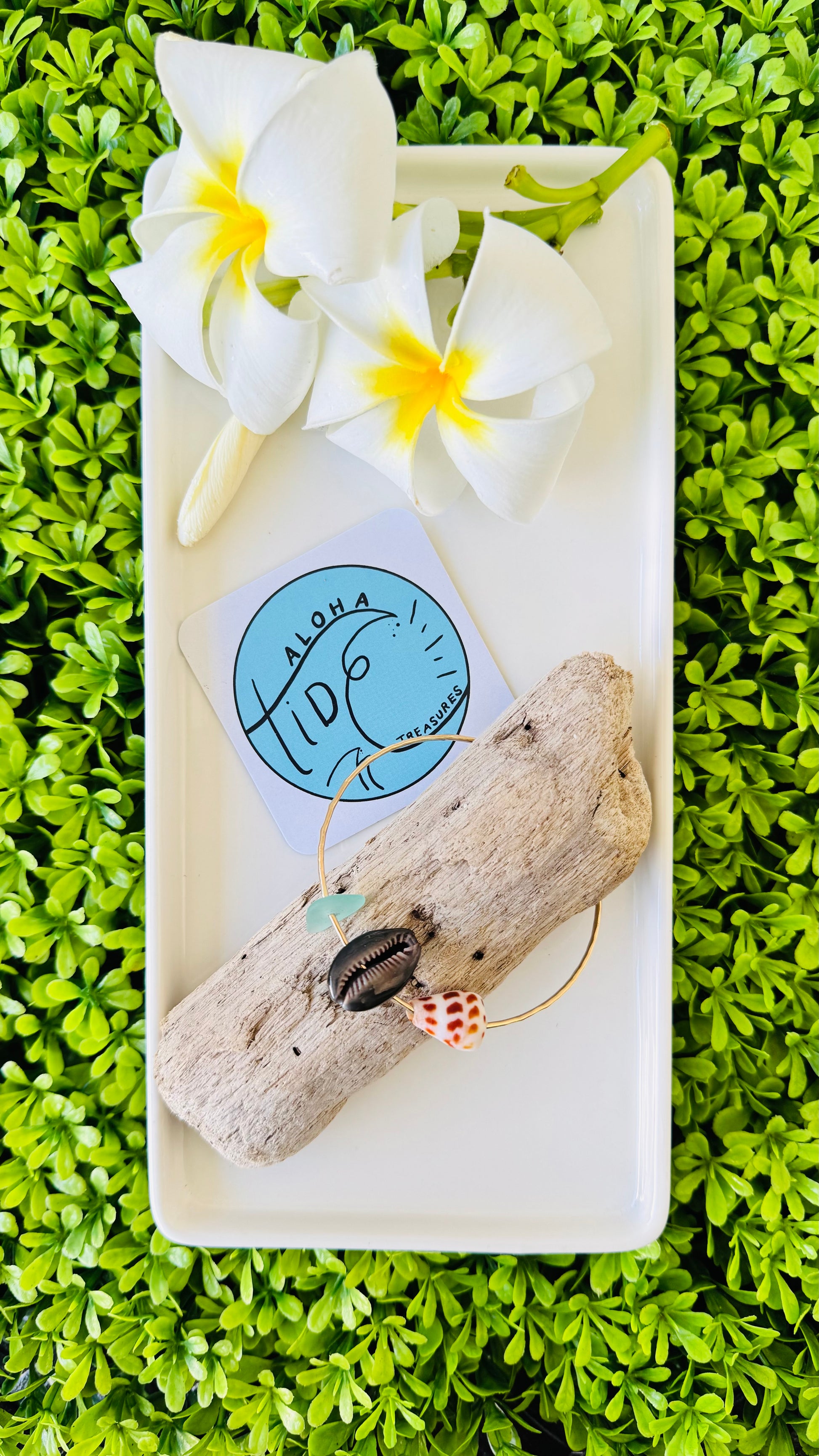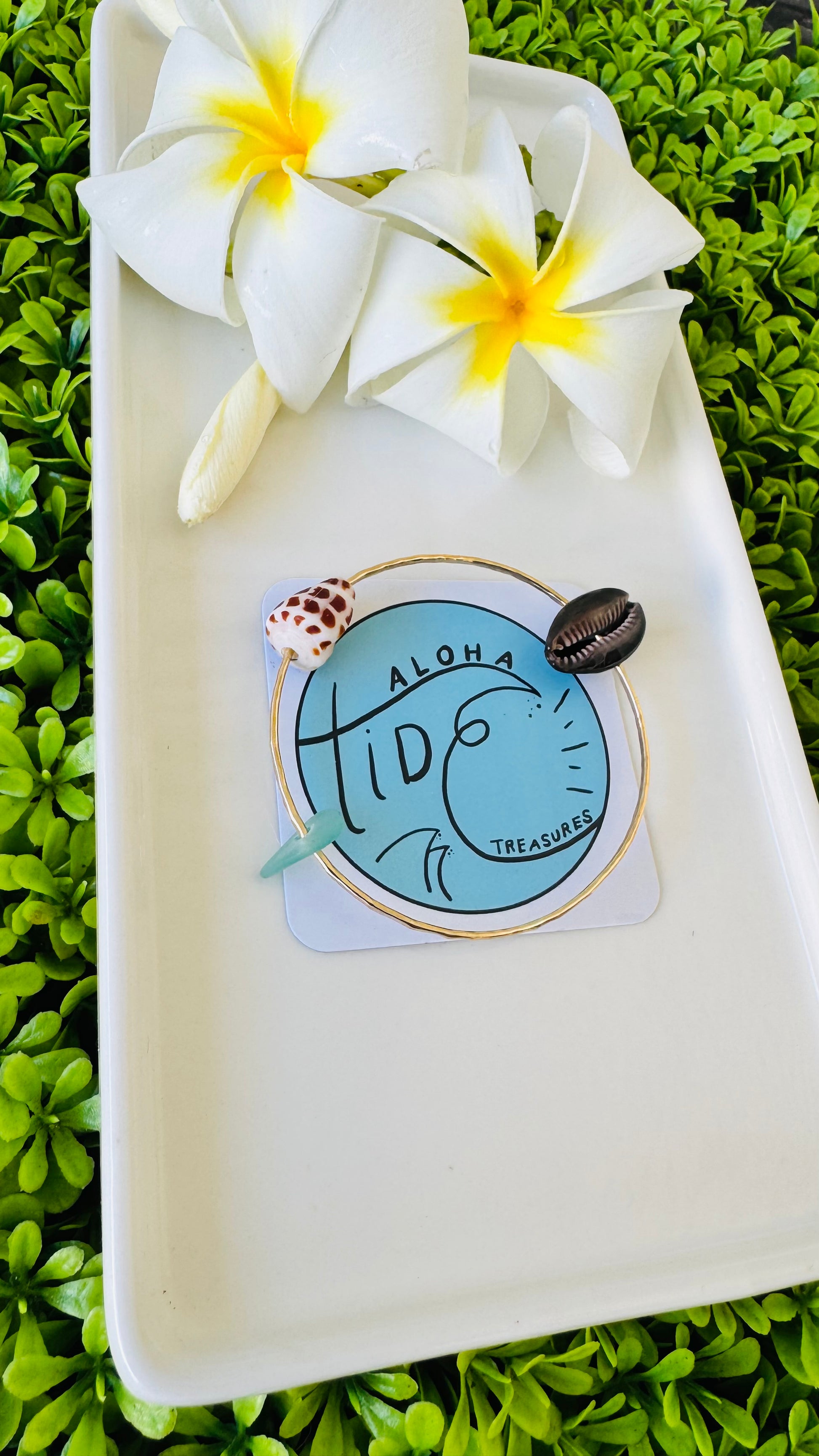 One of our customers brought us her shells and asked us to feature them on a bangle for her! Here is a 14K GF bangle with a Brown Hebrew, Blue Seaglass and a Cowrie on it! Thanks girl!