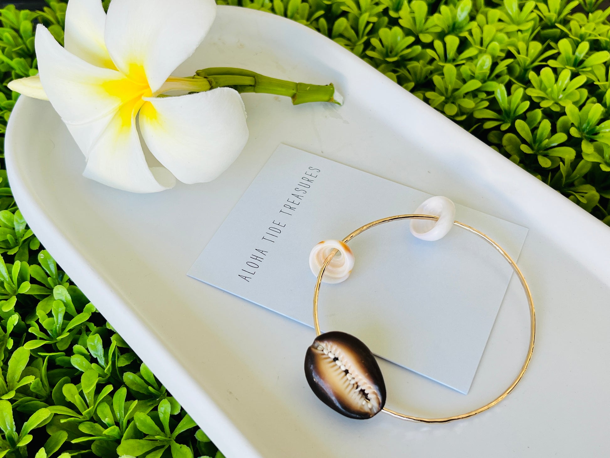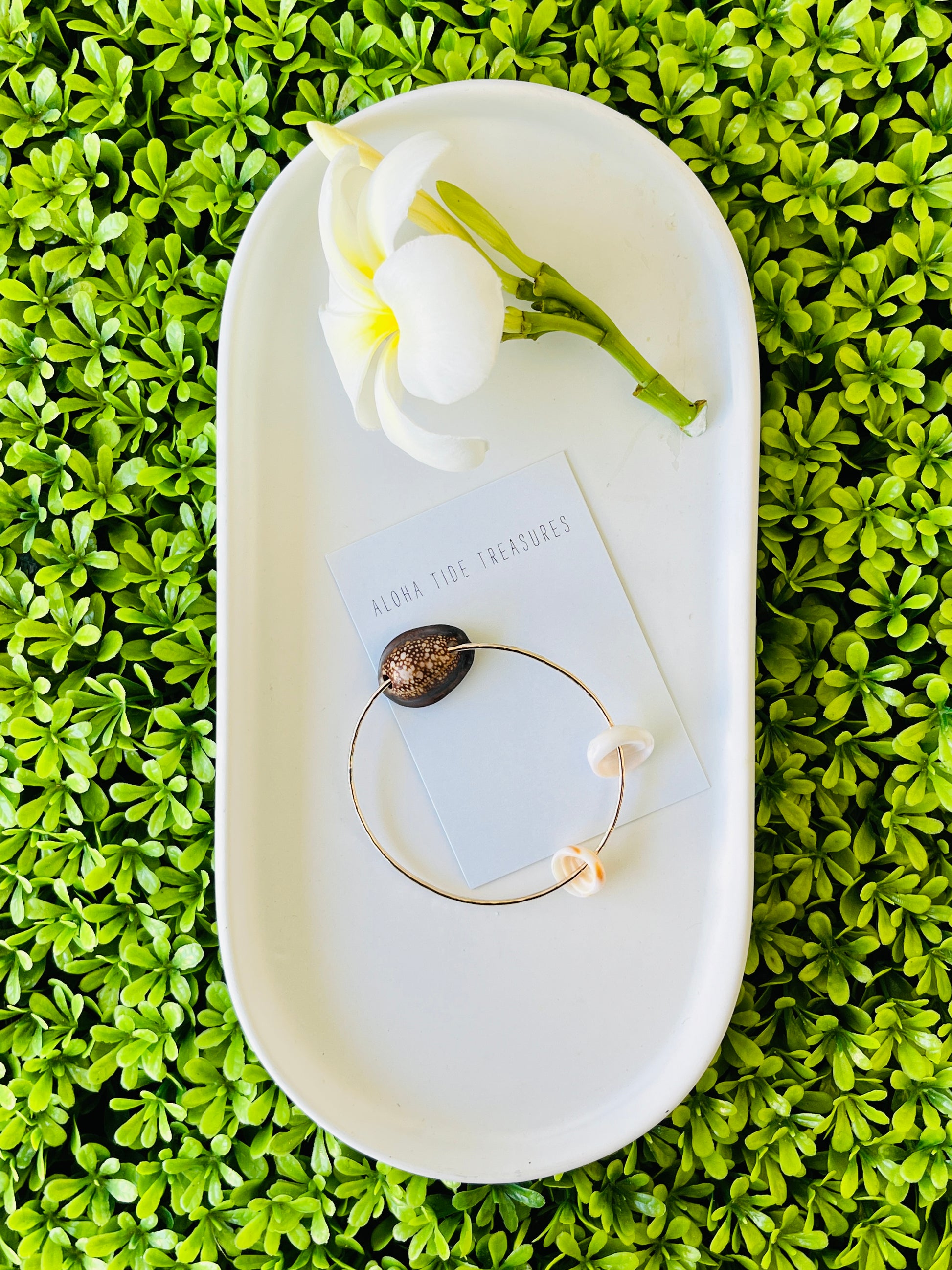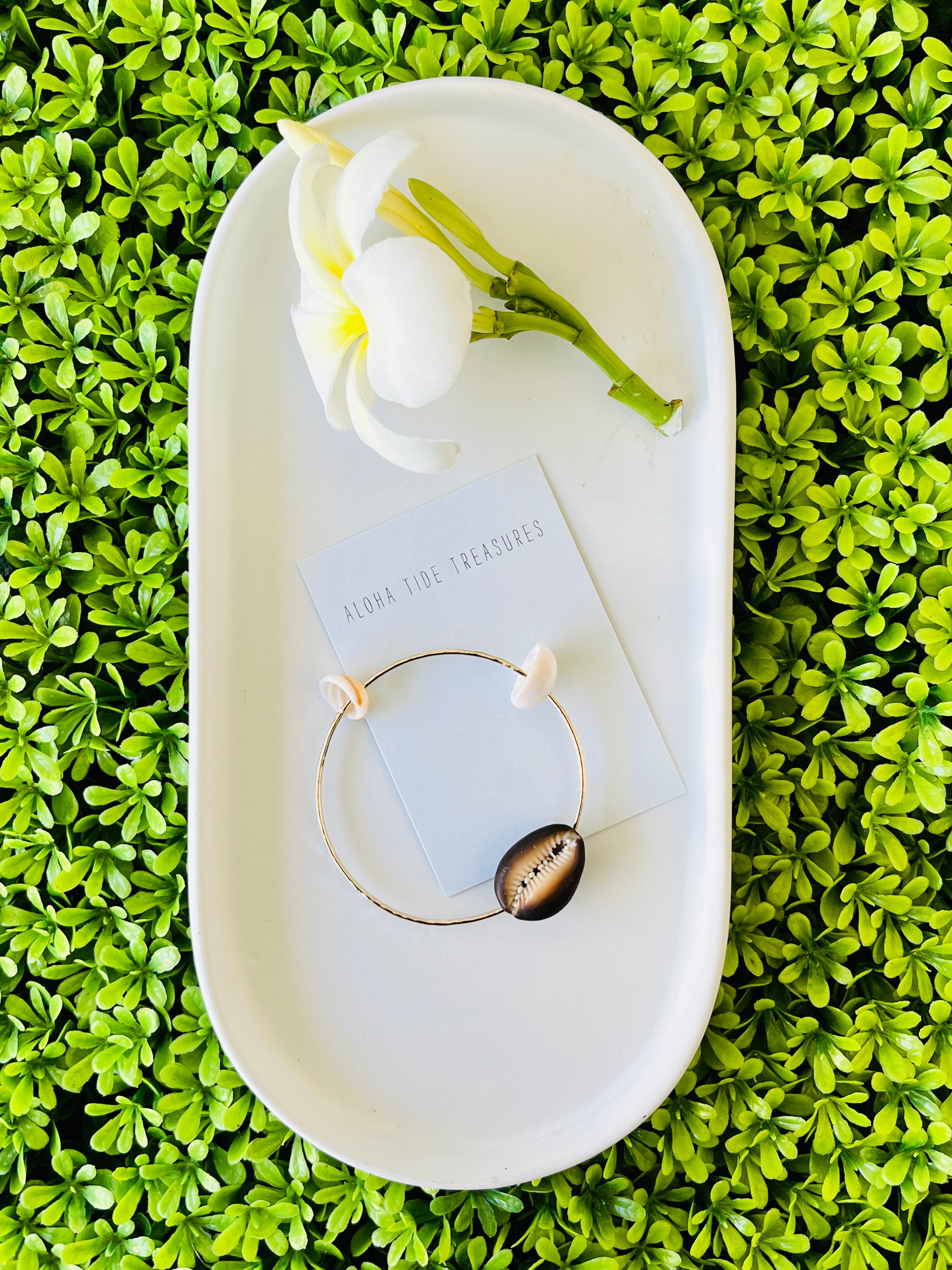 Stephanie dropped off her shells and asked us to create this beautiful bangle for her! This one features a dark Cowrie shell and 2 Puka shells measuring 7.75”! Thank you for trusting us!