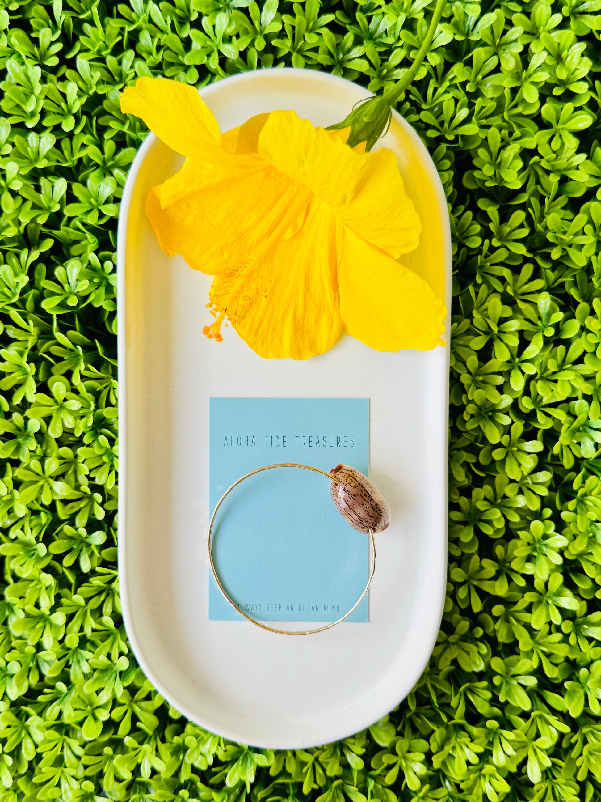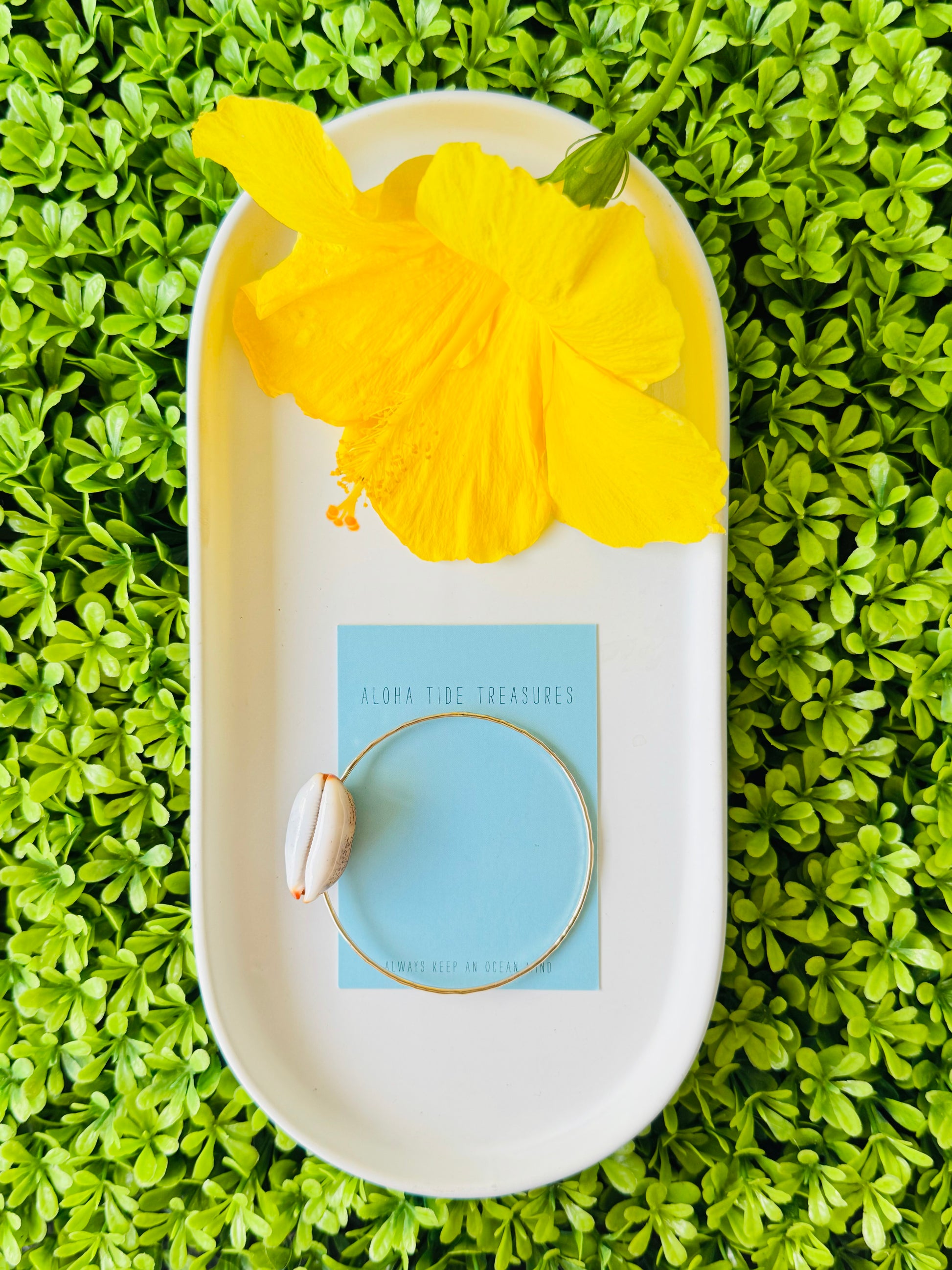 This handmade 14K Gold filled bangle features a beautiful Hawaiian Cowrie shell handpicked by myself on the island of Oahu, Hawaii!