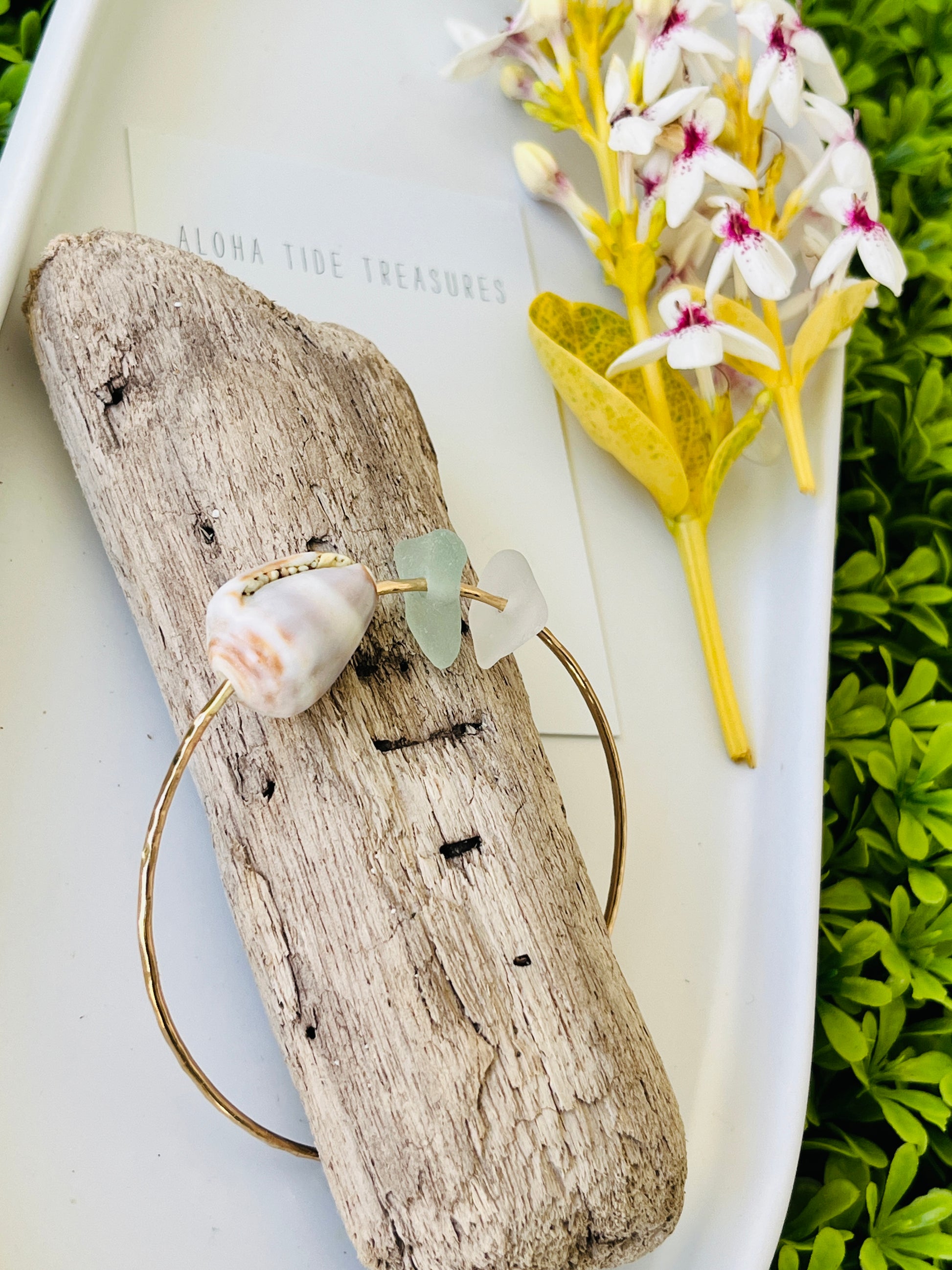 This handmade 14K Gold-filled bangle features beautiful Hawaiian shells and sea glass handpicked by myself on the island of Oahu, Hawaii. Sea glass represents renewal and healing! #mauistrong