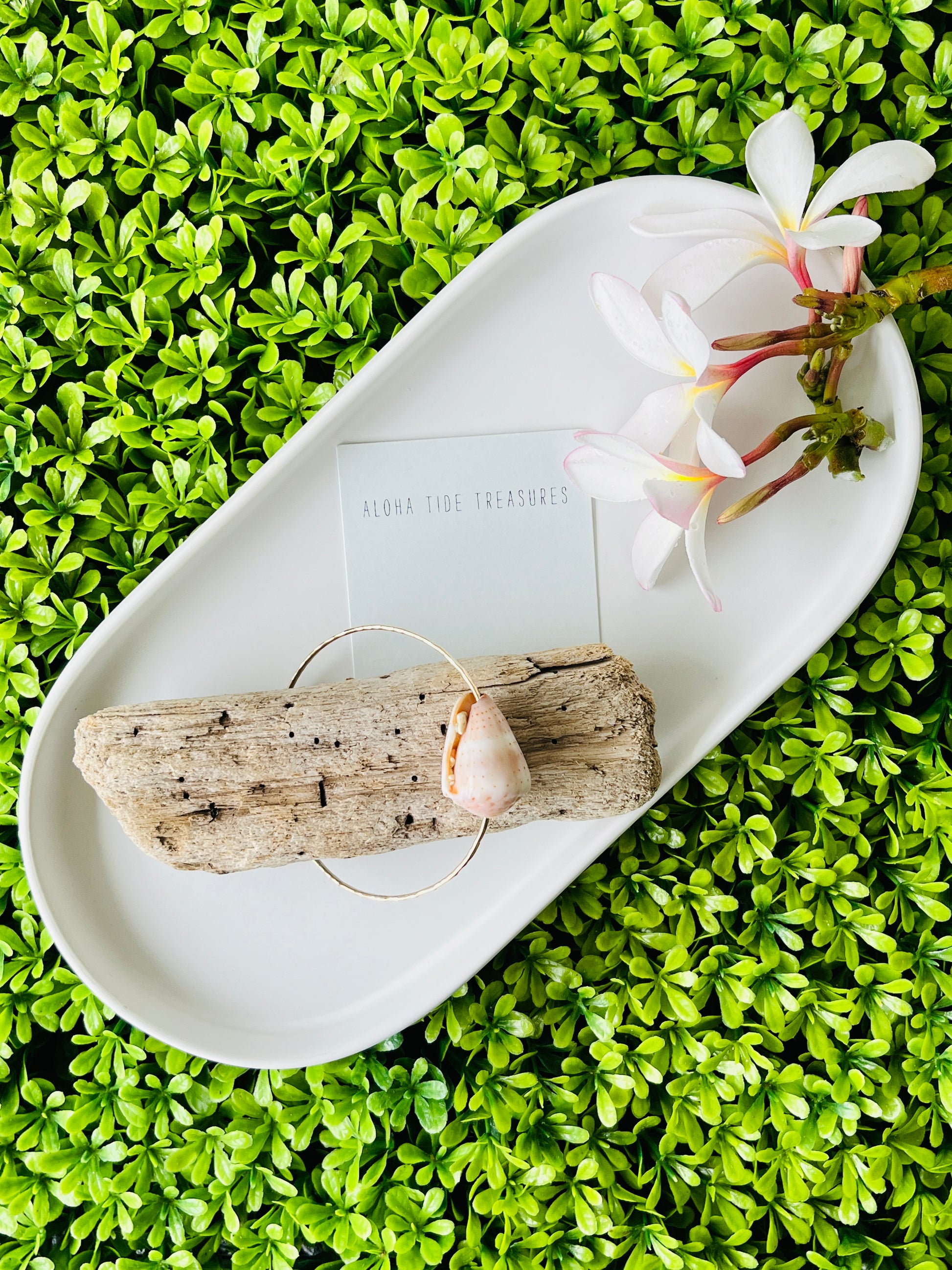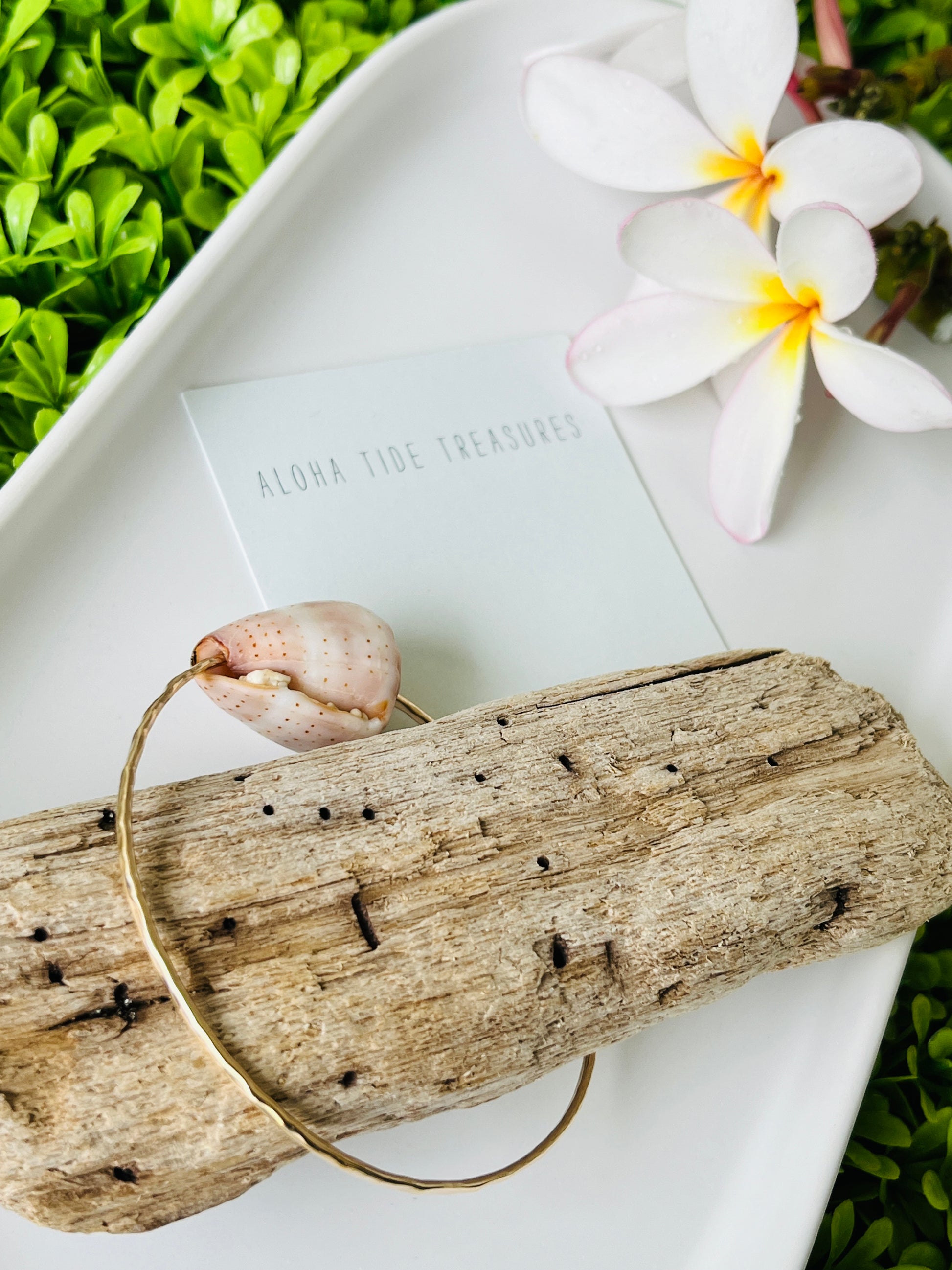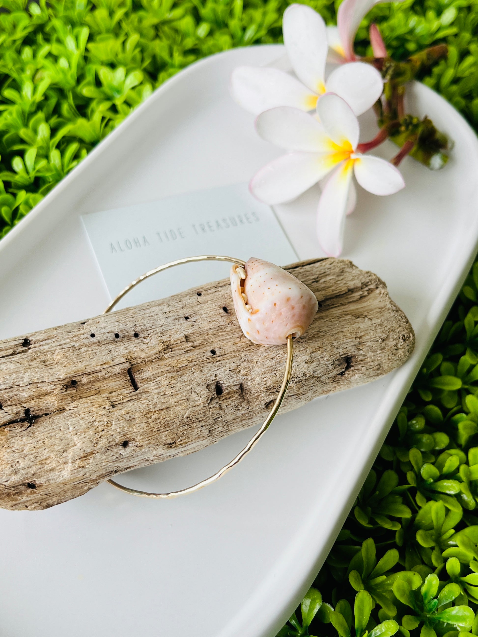 This handmade 14K Gold-filled bangle features beautiful Hawaiian shells handpicked by myself on the island of Oahu, Hawaii.