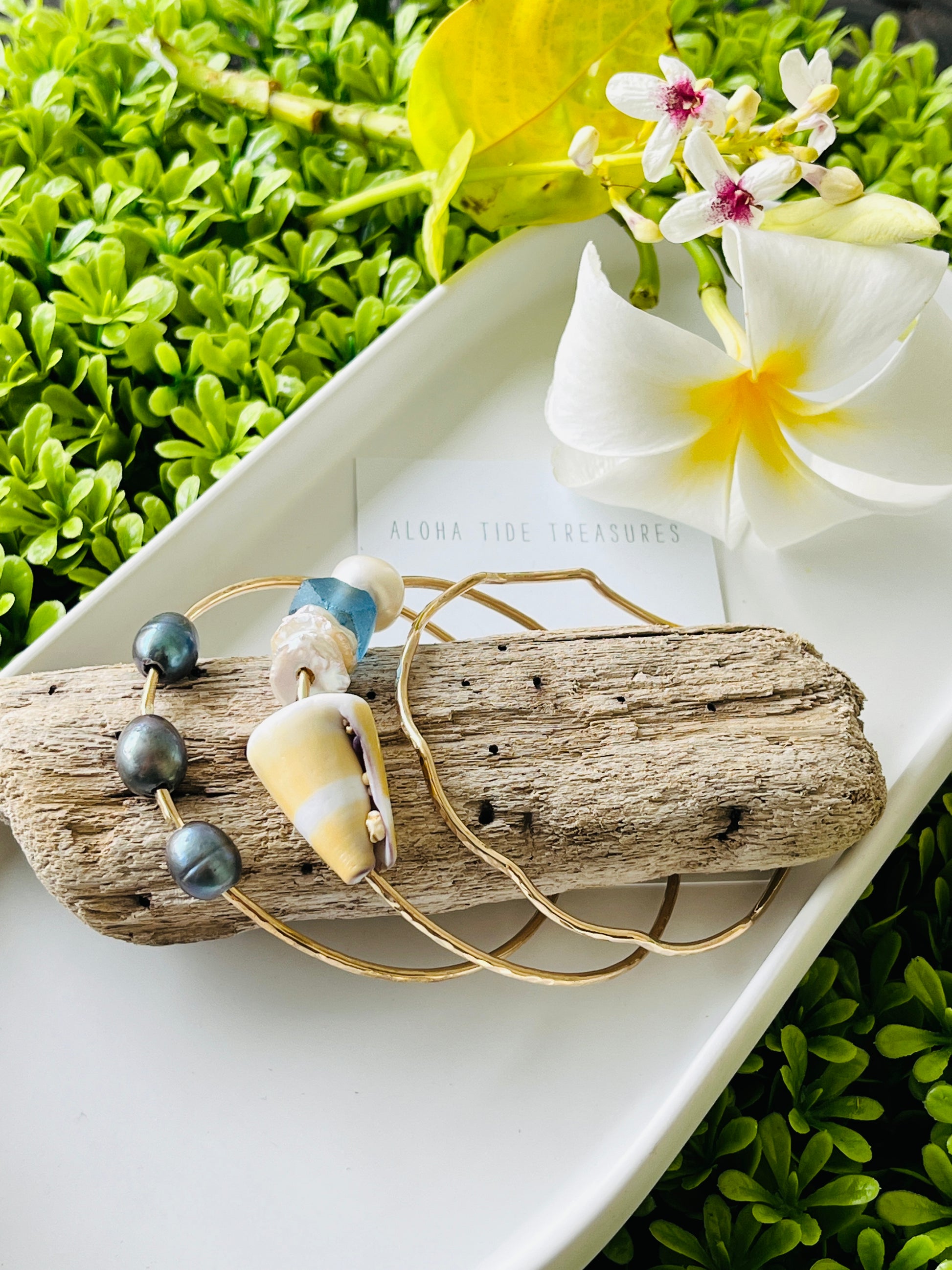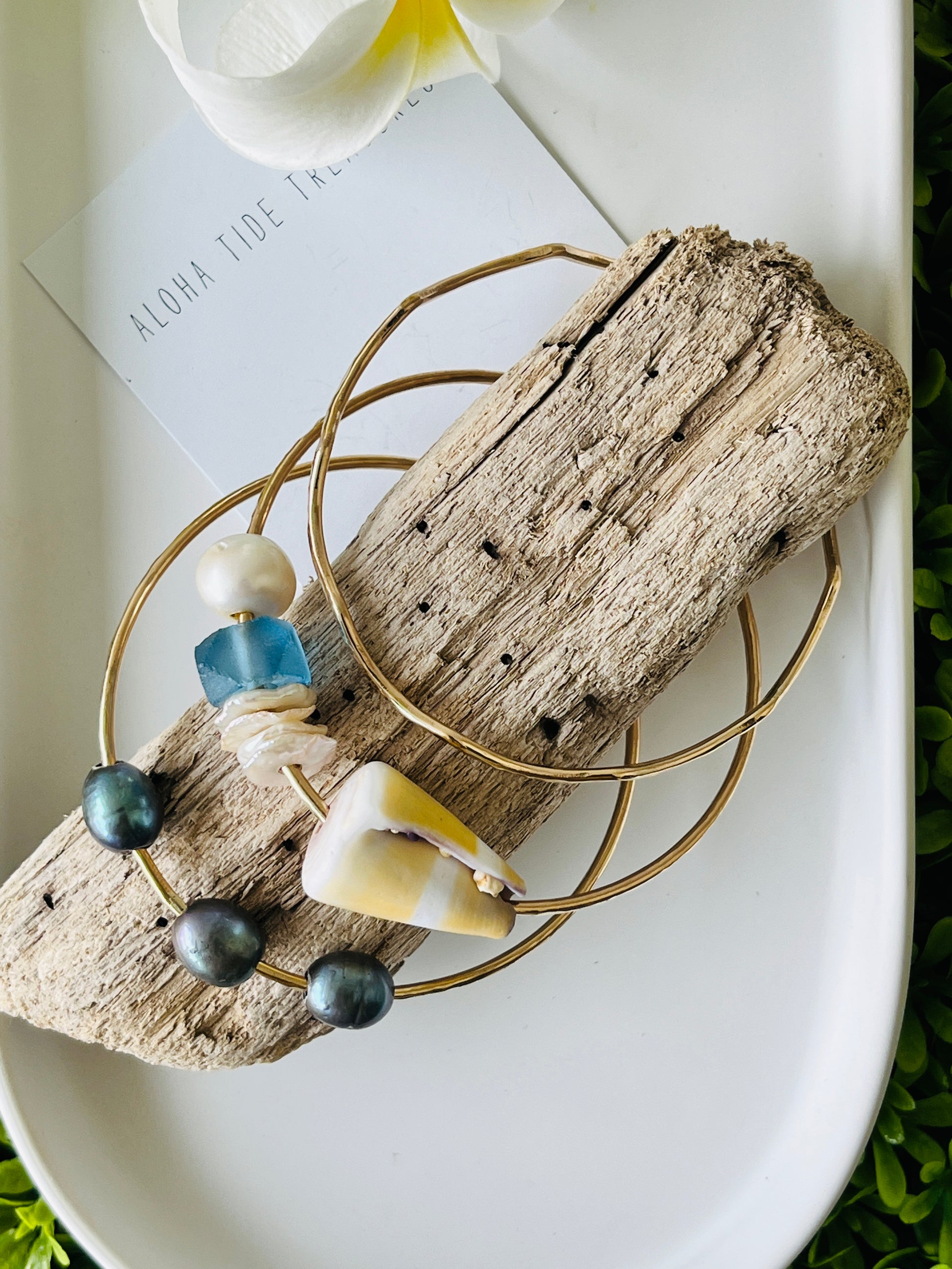 Lacey dropped off her old Sterling Silver bangles and wanted her old pearls, shells and sea glass on 12 Gauge 14K Gold Filled bangles with an added Wave bangle to complete her Aloha Tide Treasures set!