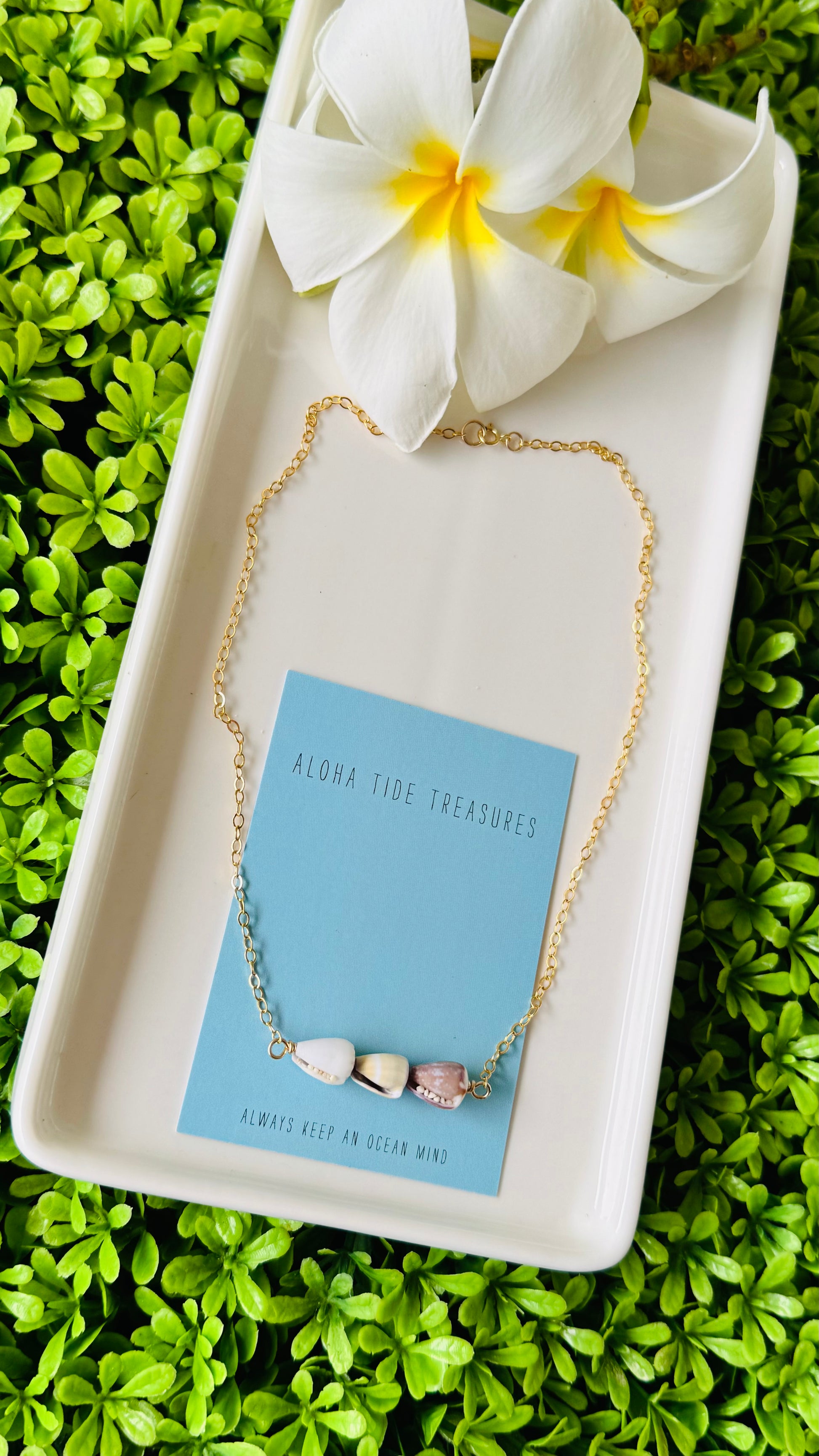 Another first! 3 beautiful mini Hawaiian Cone Shells sitting on a bar designed to spin around. Measures 16” and all on 14K Gold Filled chain.