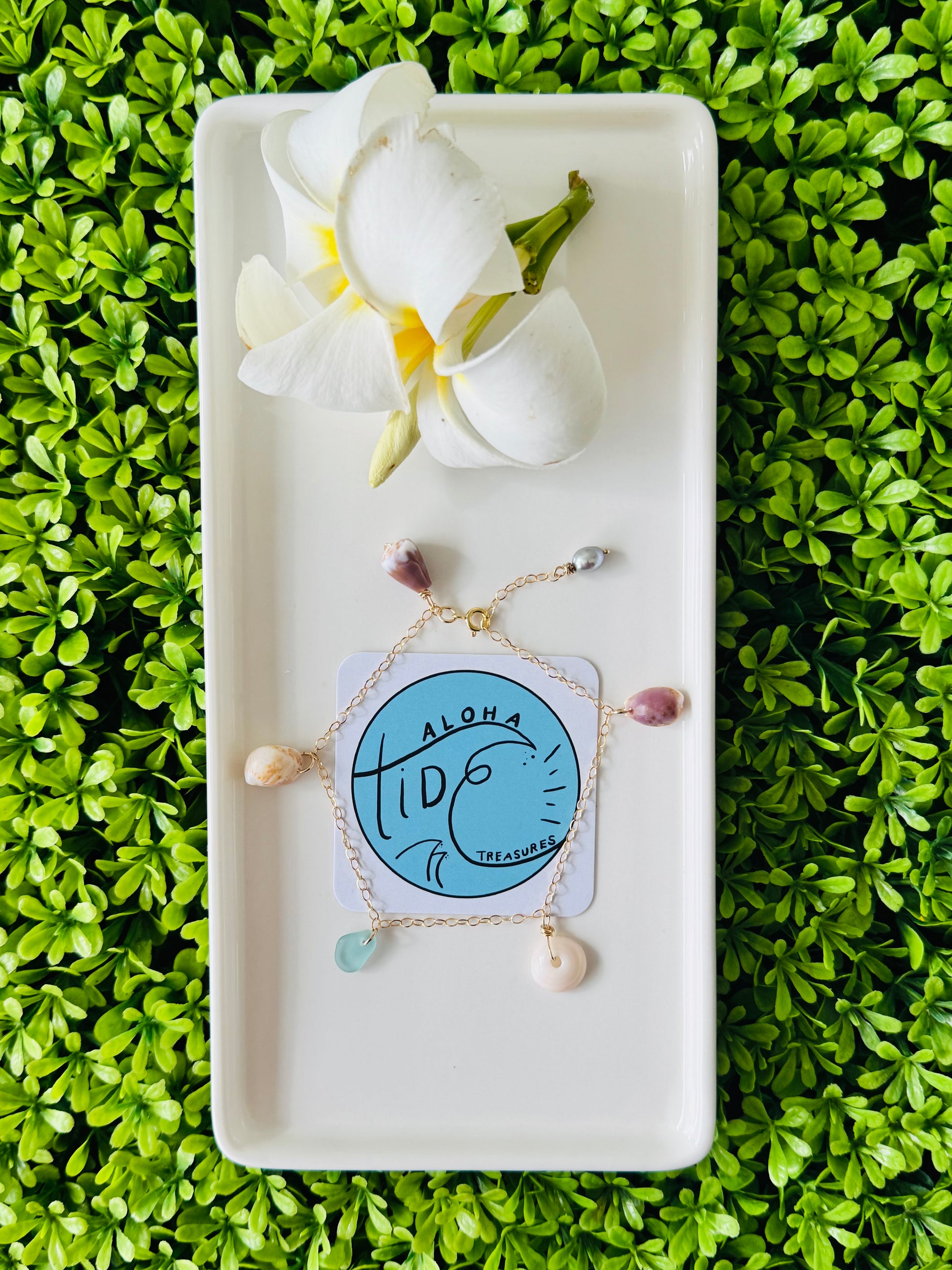 Cully came back and asked us to create her one of these because she bought one for her sister and feel in love ! Here is a 14K Gold filled anklet measuring 10” with Hawaiian shells and sea glass with an added Freshwater Pearl on the end!