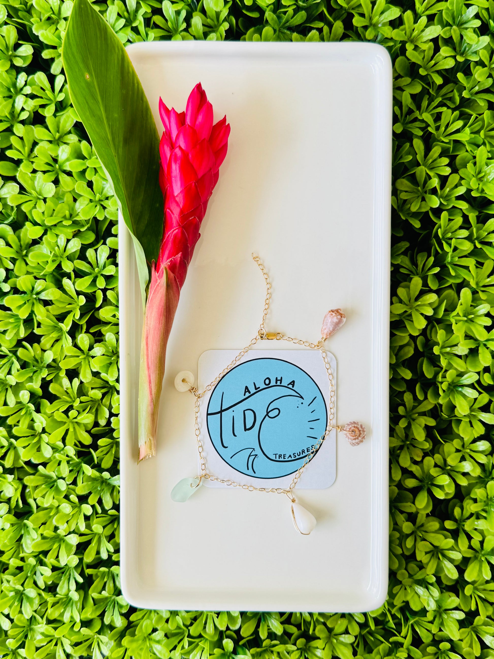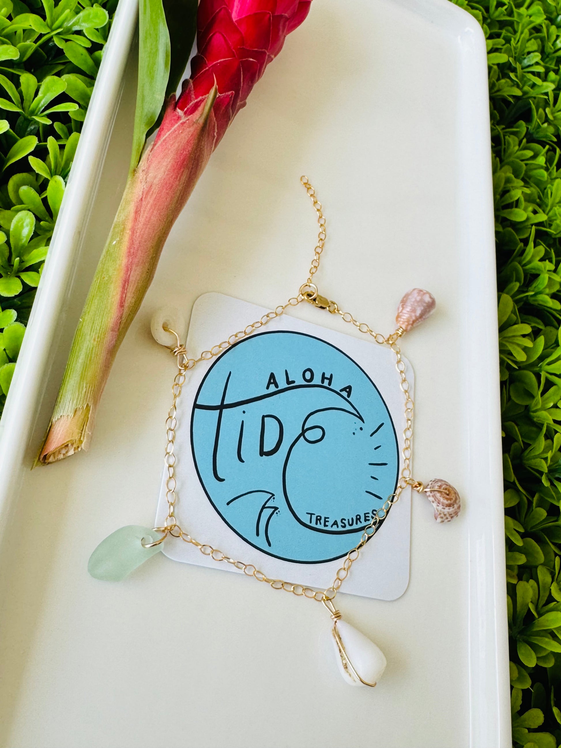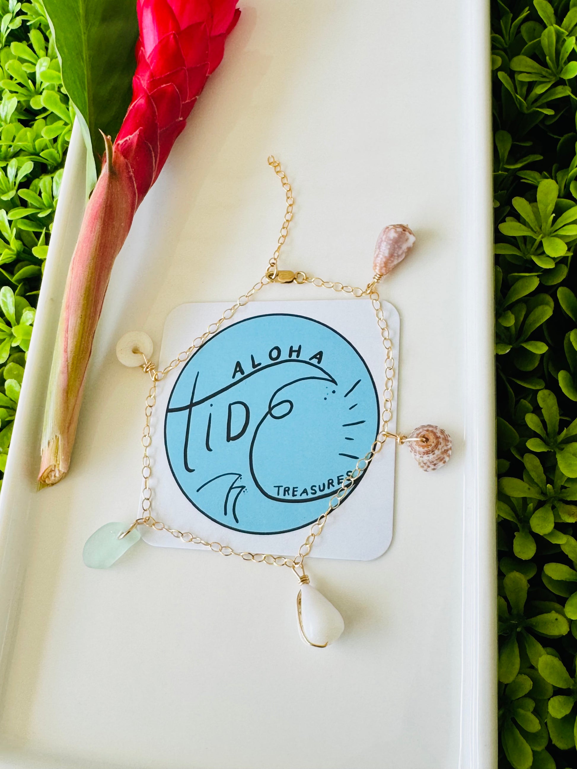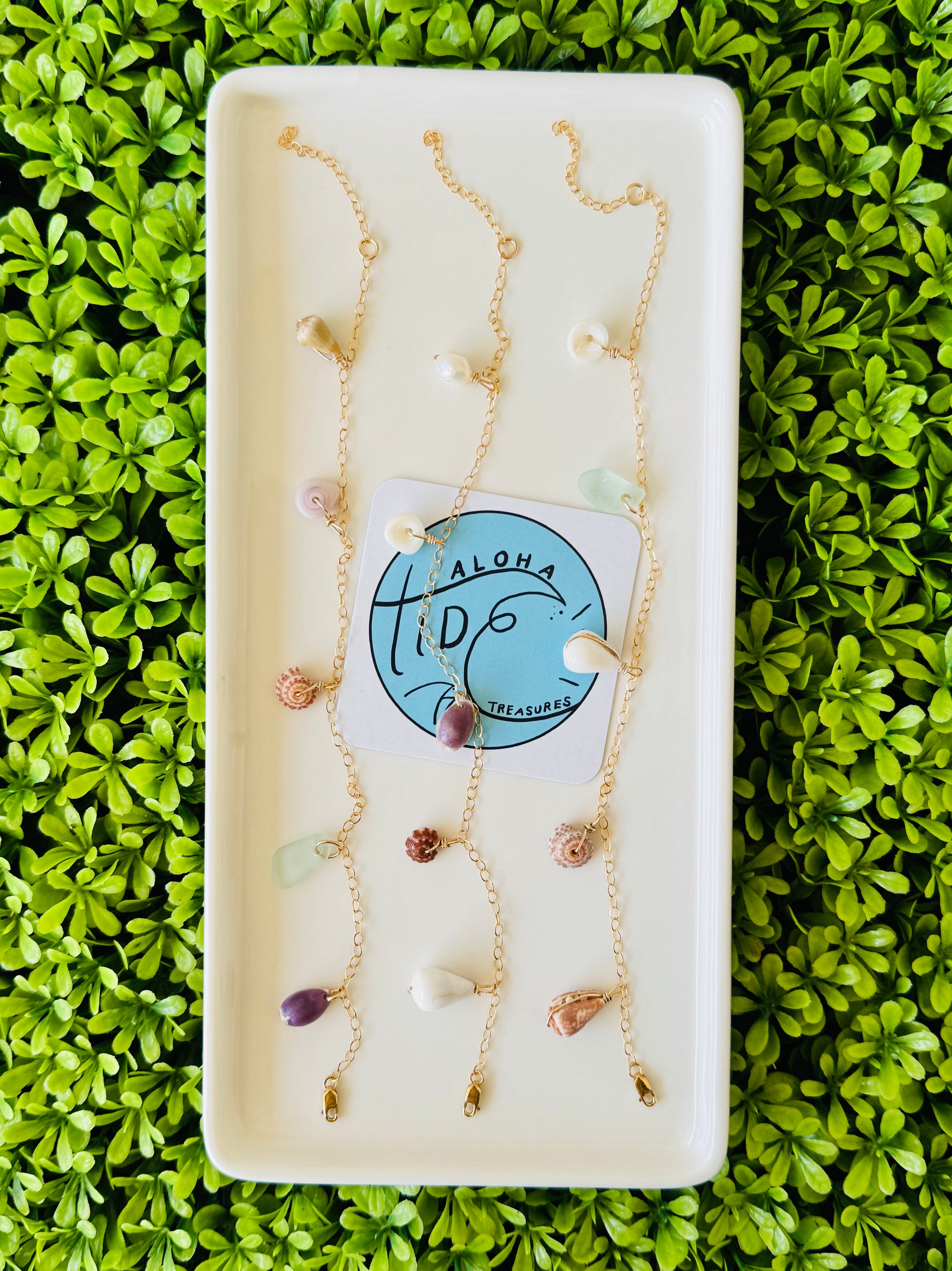A recent customer asked for these and we fell in love. Here is a 14K Gold Filled Anklet with 5 beautiful locally found Hawaiian Shells/Seaglass dangling. Measures 8.5” with an added 1.5” extender!