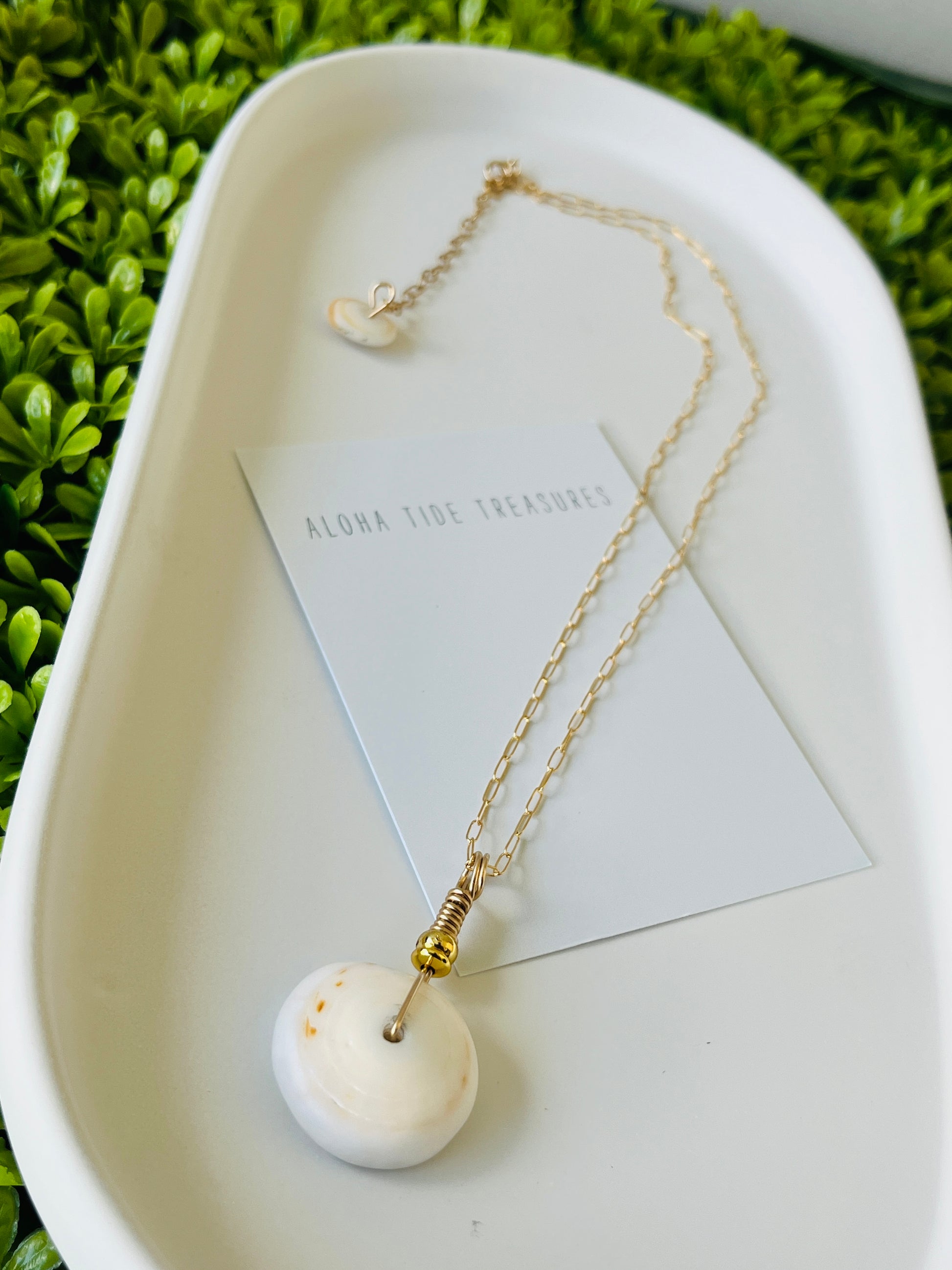 Locally found beautiful Puka Shell hung from 14K Gold Filled Chain and wire measuring 16 inches with adjustable chain.