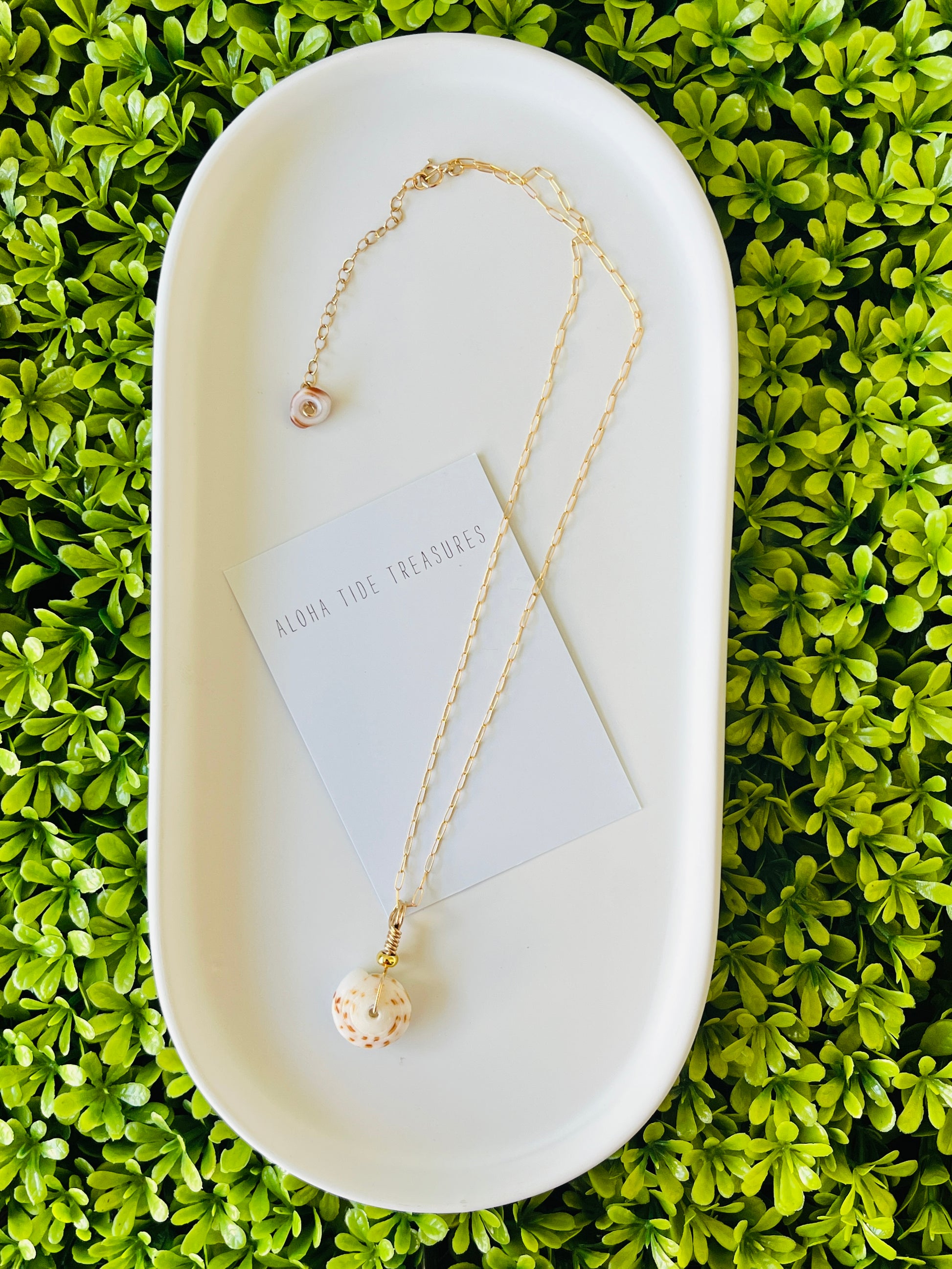 Locally found beautiful Puka Shell hung from 14K Gold Filled Chain and wire measuring 16 inches with adjustable chain.