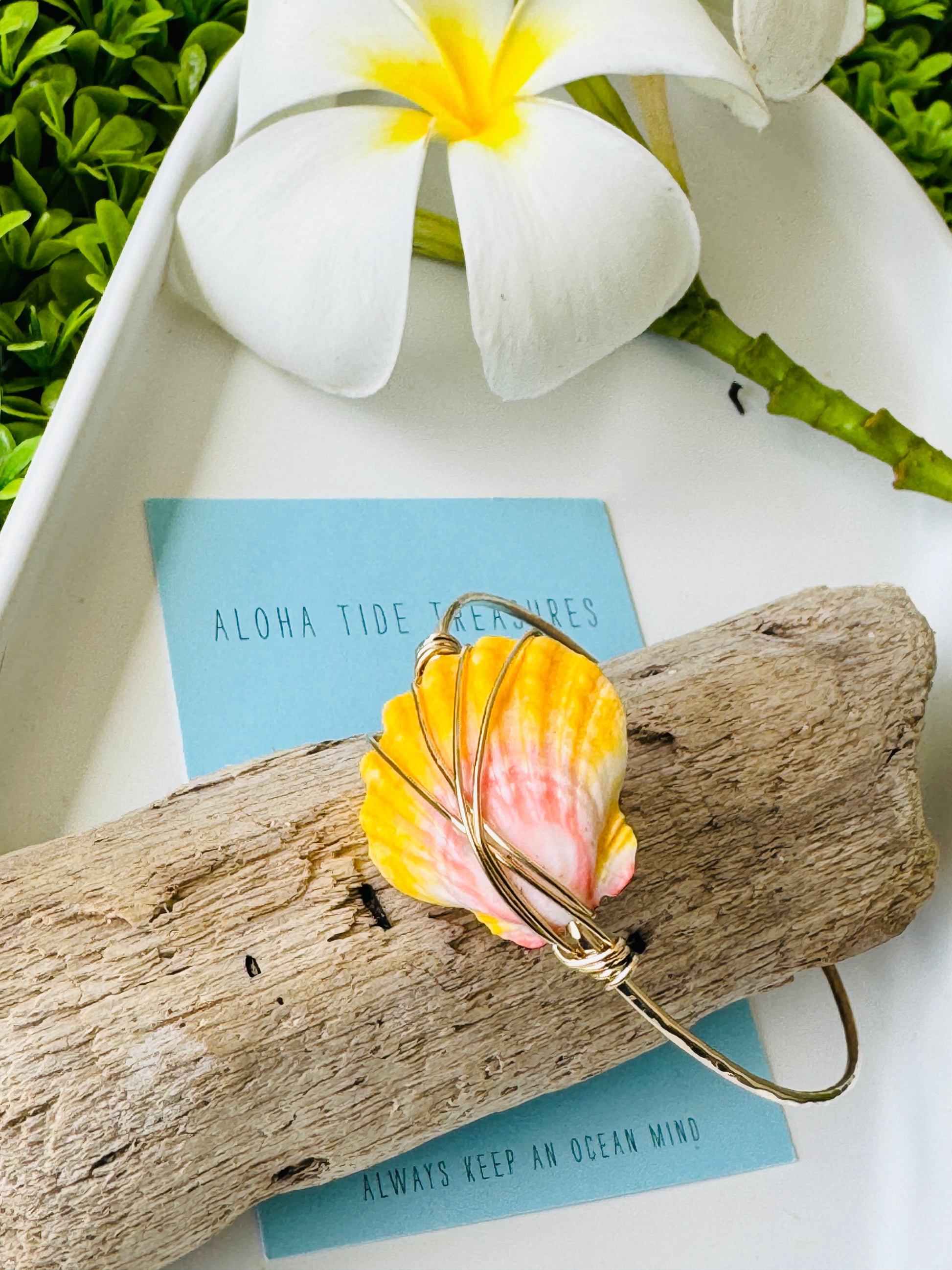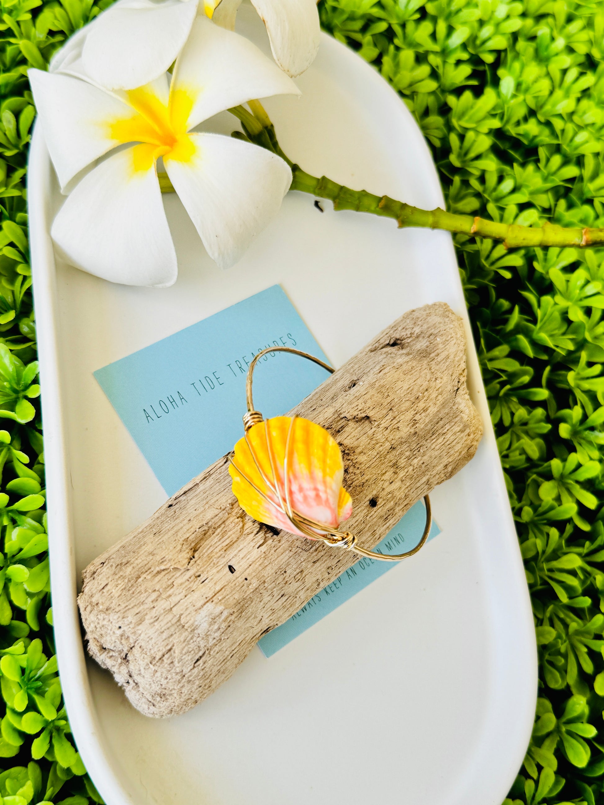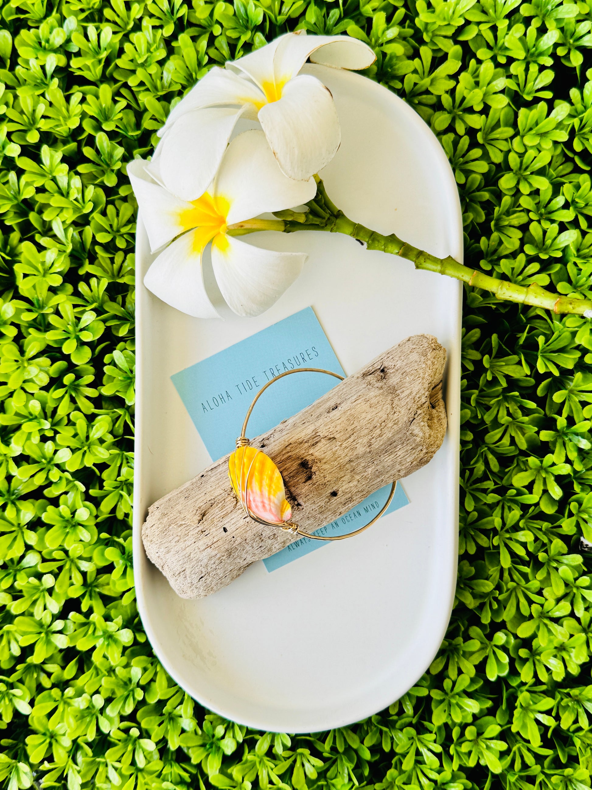 Another military wife and small business owner asked us to make her a bangle with a Sunrise Shell wrapped. This was new to us but we always love trying new things! Here is a Hawaiian Sunrise Shell wrapped on 14K Gold Filled wire measuring 8”. Thank you for trusting us!