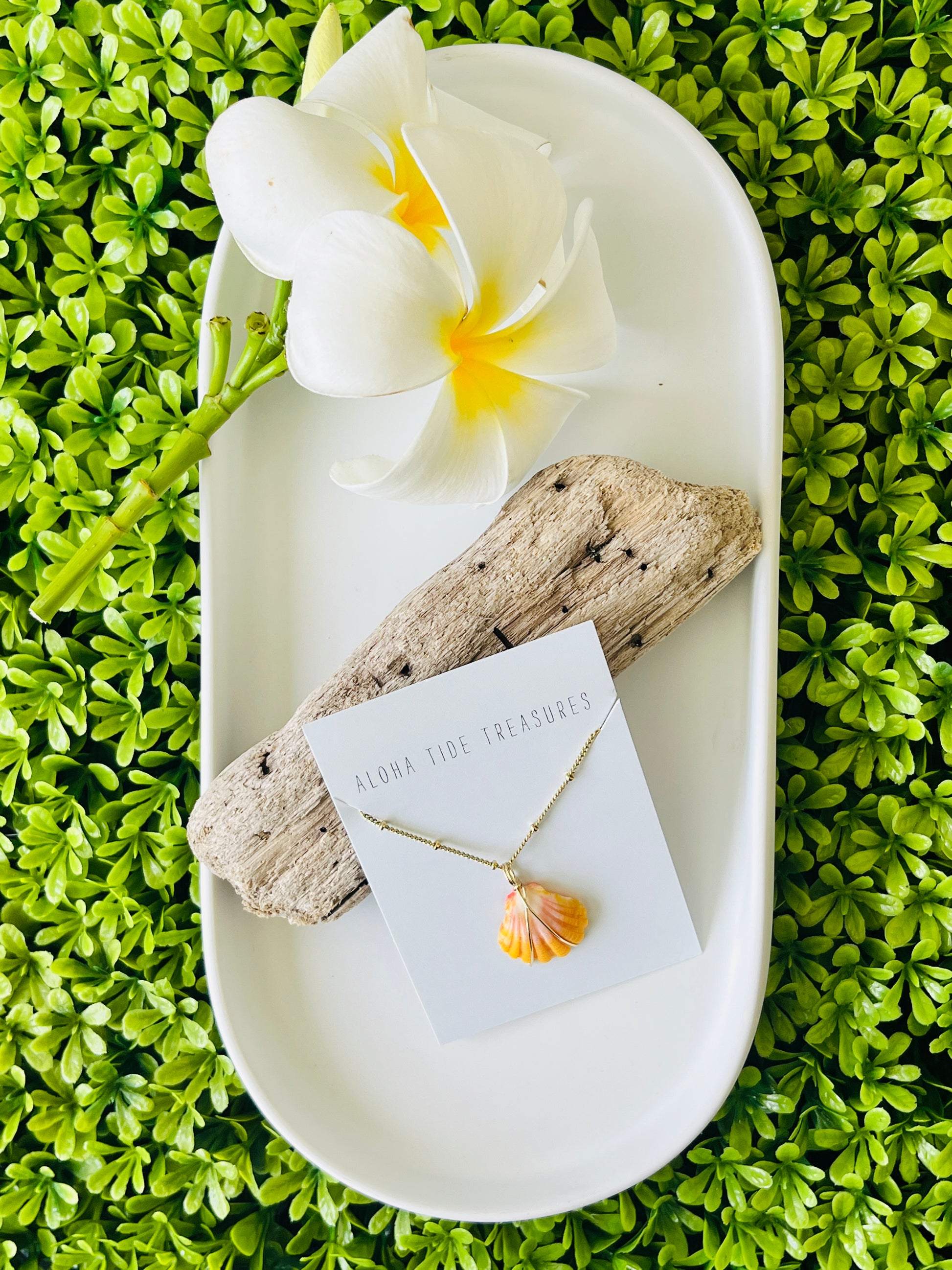 Locally found Hawaiian Sunrise Shell hung on a 16" 14K Gold Satellite Chain with an Adjustable chain and Puka Shell on the end.