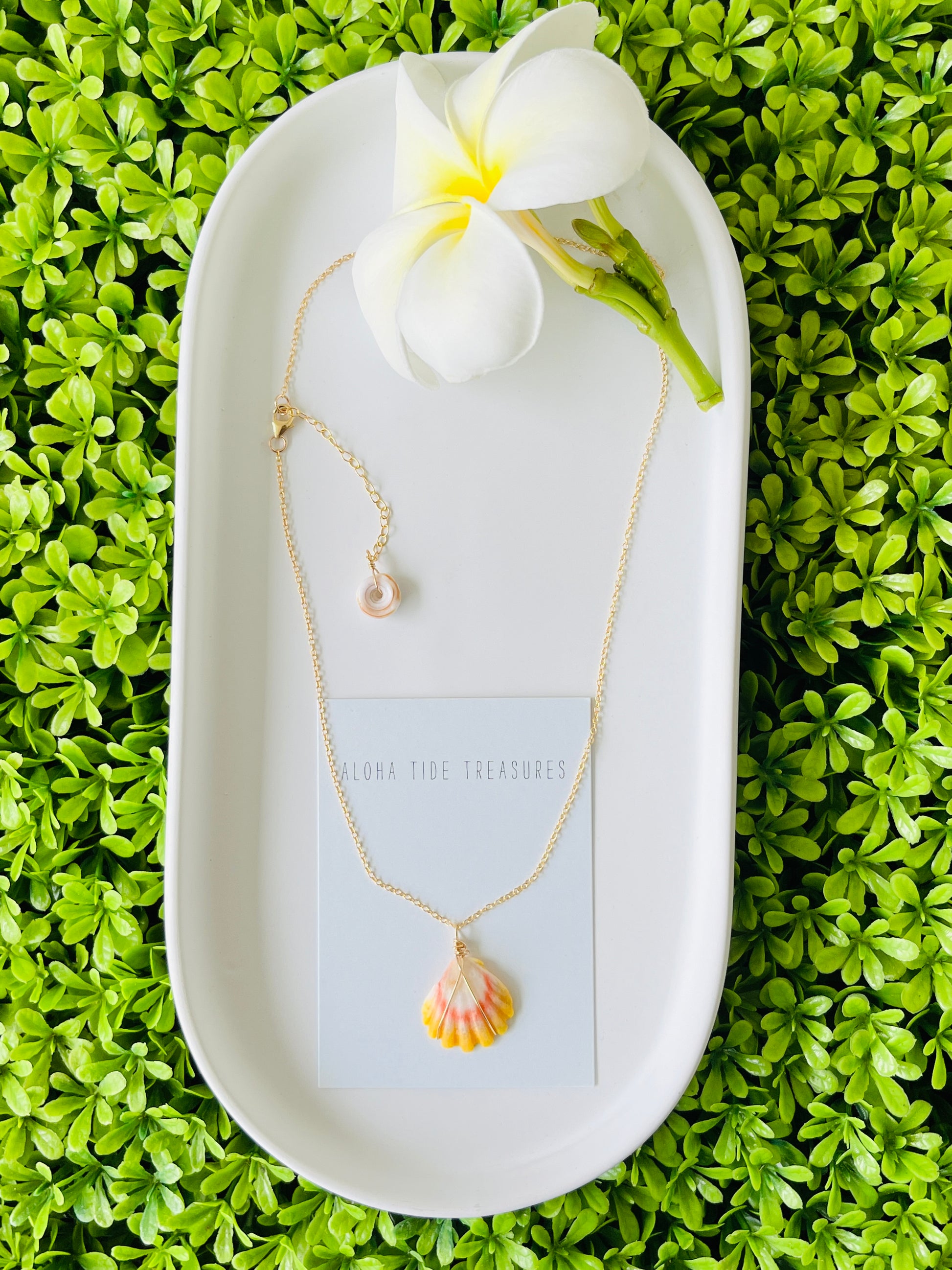 Locally found Hawaiian Sunrise Shell wrapped and hung on 16" 14K Gold Filled Chain with 2” Extender and Puka Shell on the end.