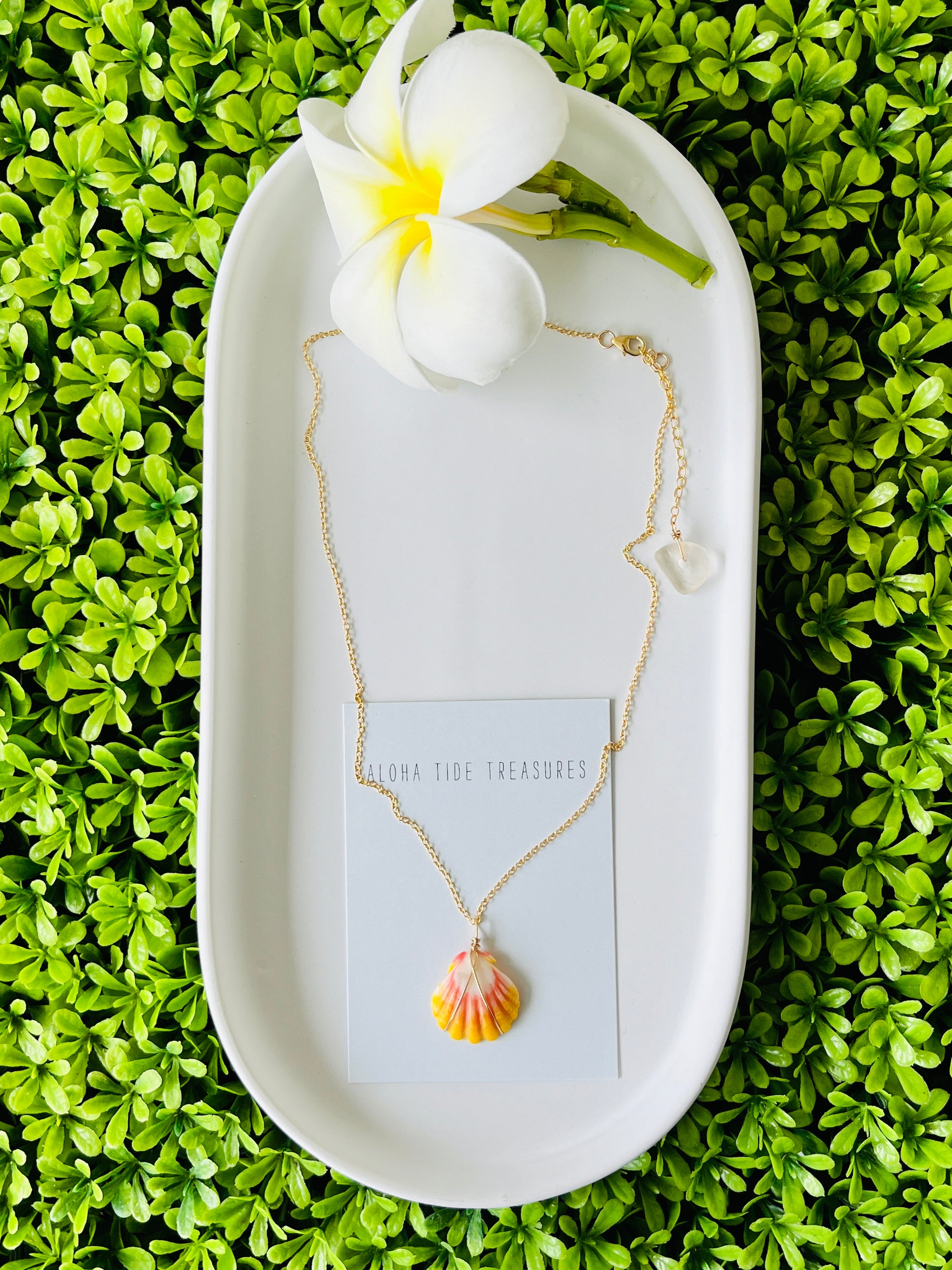Locally found Hawaiian Sunrise Shell wrapped and hung on 16" 14K Gold Filled Chain with 2” Extender and White Sea Glass on the end.