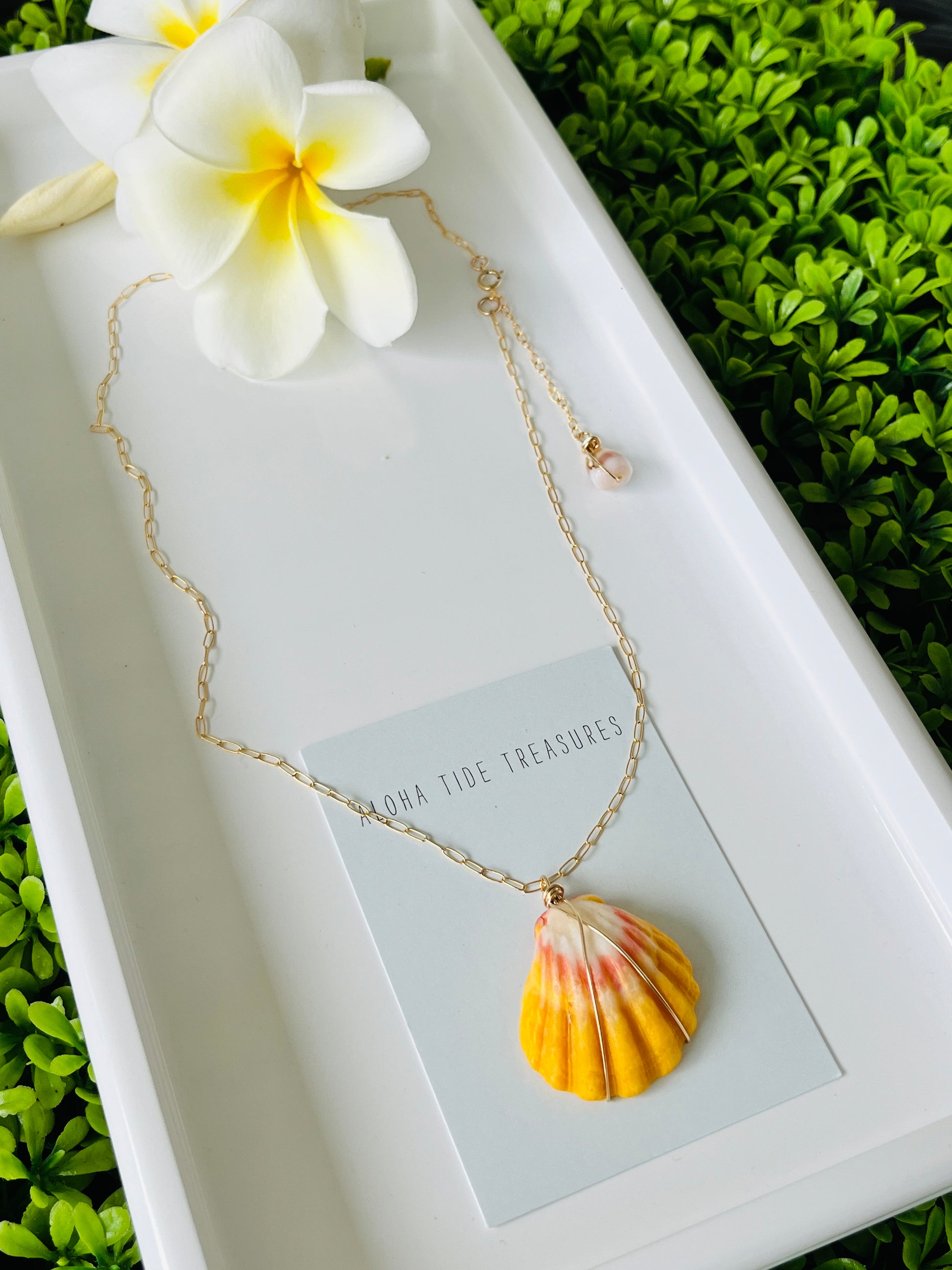 One of our great friends Tiffany brought us her Sunrise Shells and wanted to create this for one of her daughters! Here is a beautiful Hawaiian Sunrise Shell wrapped and hung on 14K Gold Filled Paperclip Chain at 18” and an added 2” extender! We hope you and your girls enjoy these treasures!
