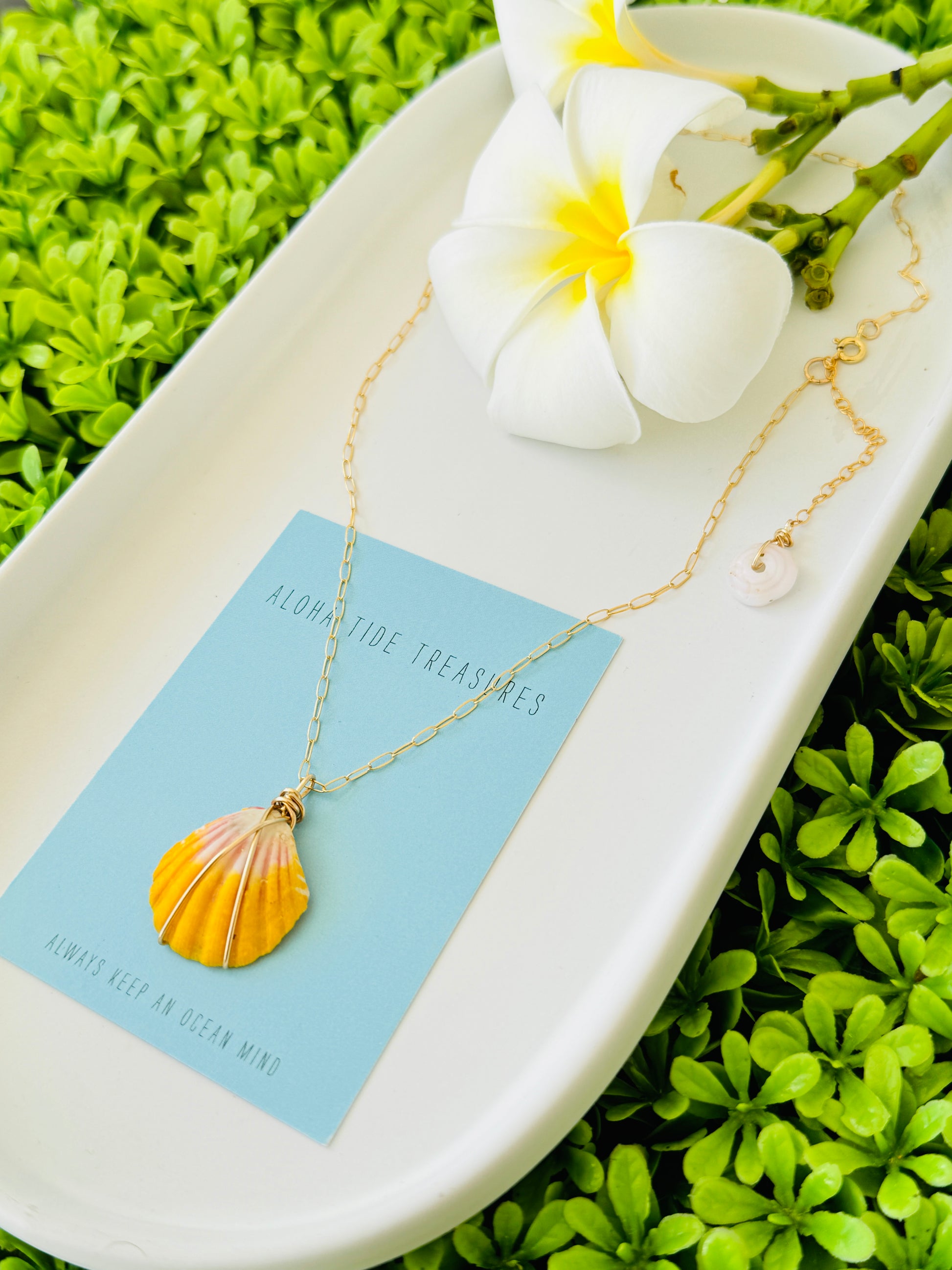 Locally found Hawaiian Sunrise Shell wrapped and hung on 16" 14K Gold Filled Paperclip Chain with 2” Extender and Puka Shell on the end.