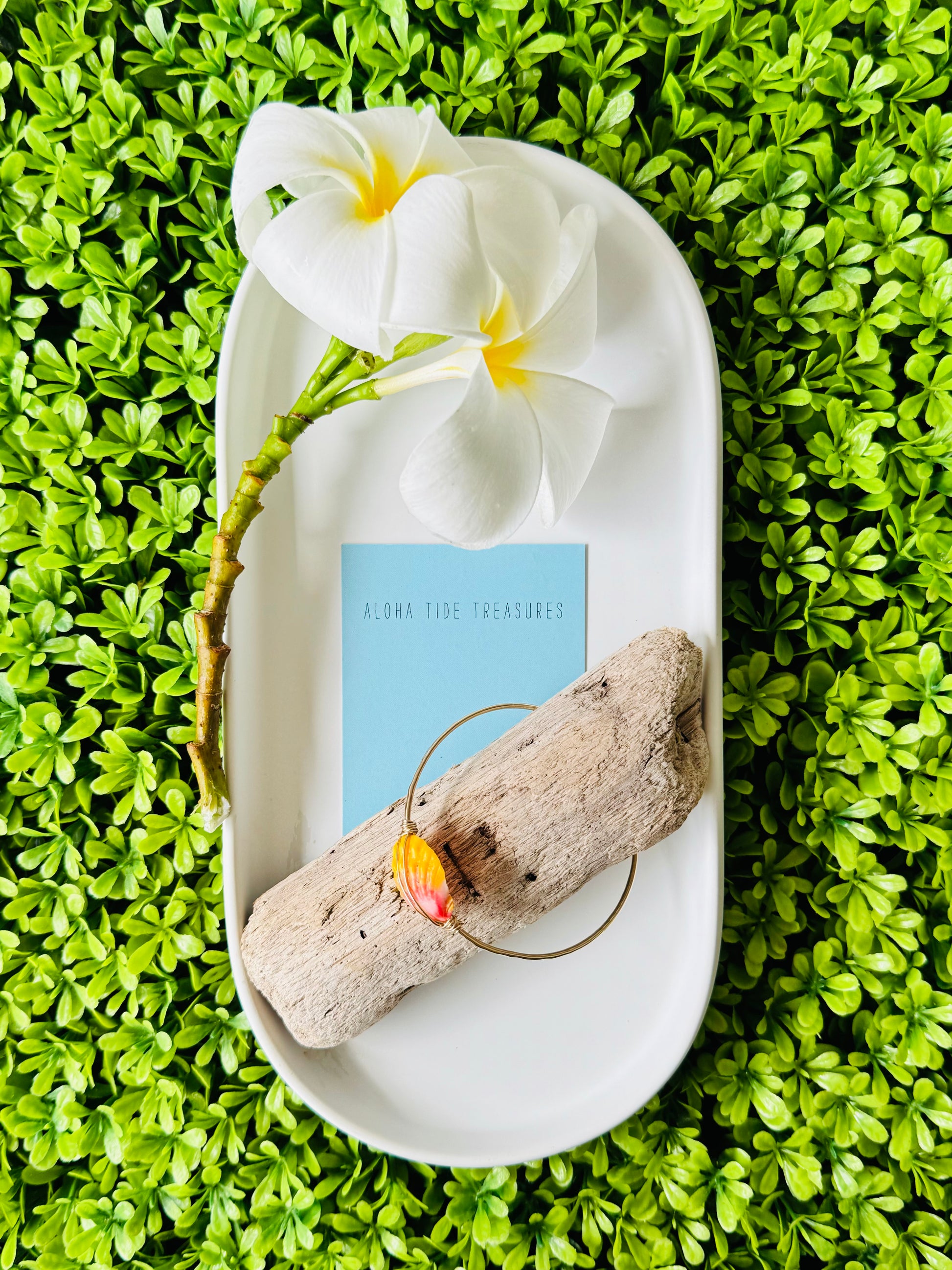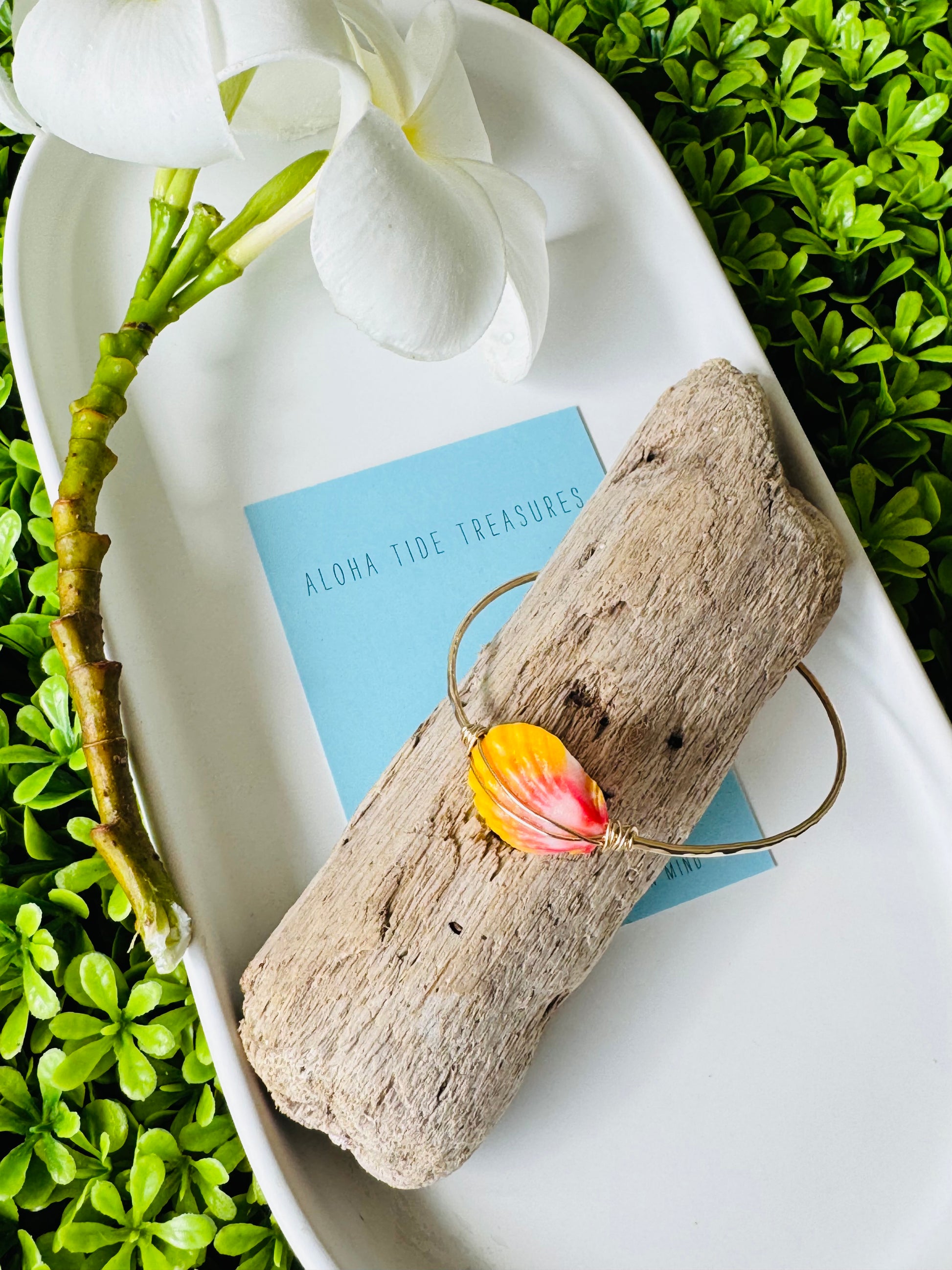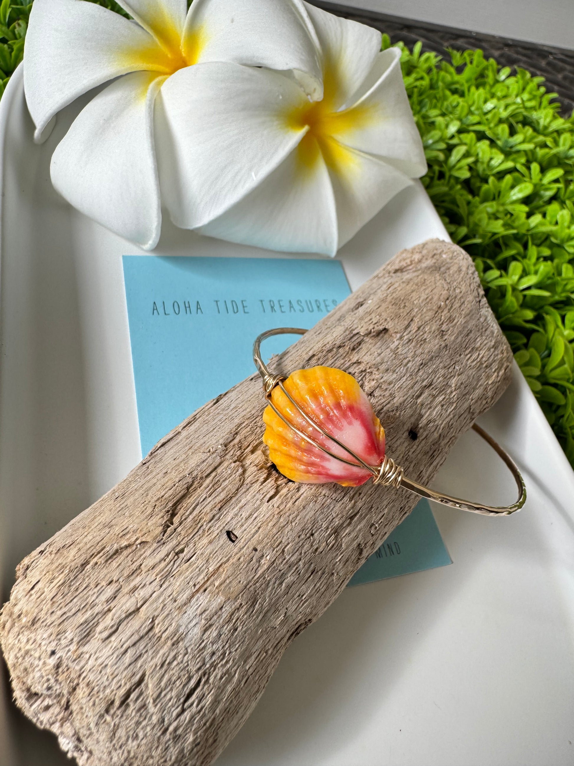 Wow these are a hit. Our dear friend Andrea came to us with a Hawaiian Sunrise Shell she found here in Hawaii on a beach cleanup! Asked us to wrap it on a 14K Gold Filled Bangle for her. Thanks for trusting us Andrea! Malaga Aina!