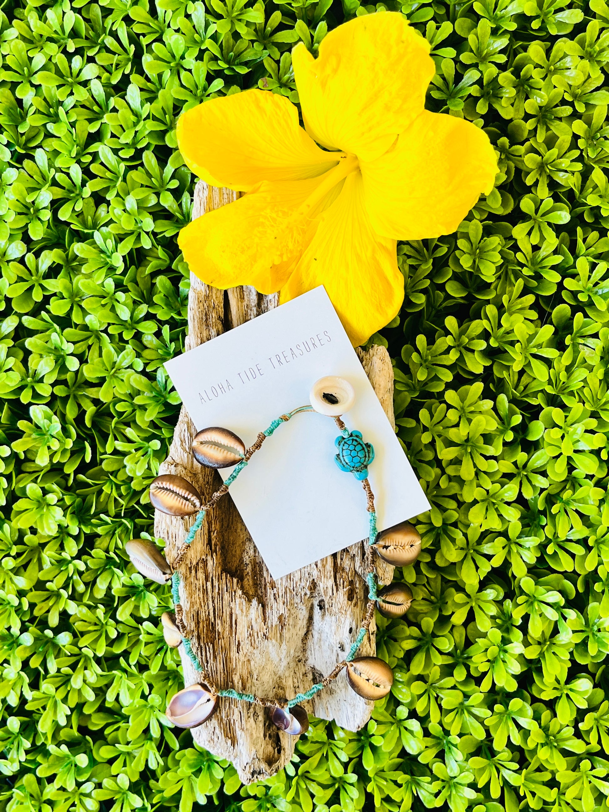 Custom Cowrie Shell Anklet measuring 11” from knot to knot. Finished with a Puka Shell to secure it! Meant to sit beautifully below the ankle!