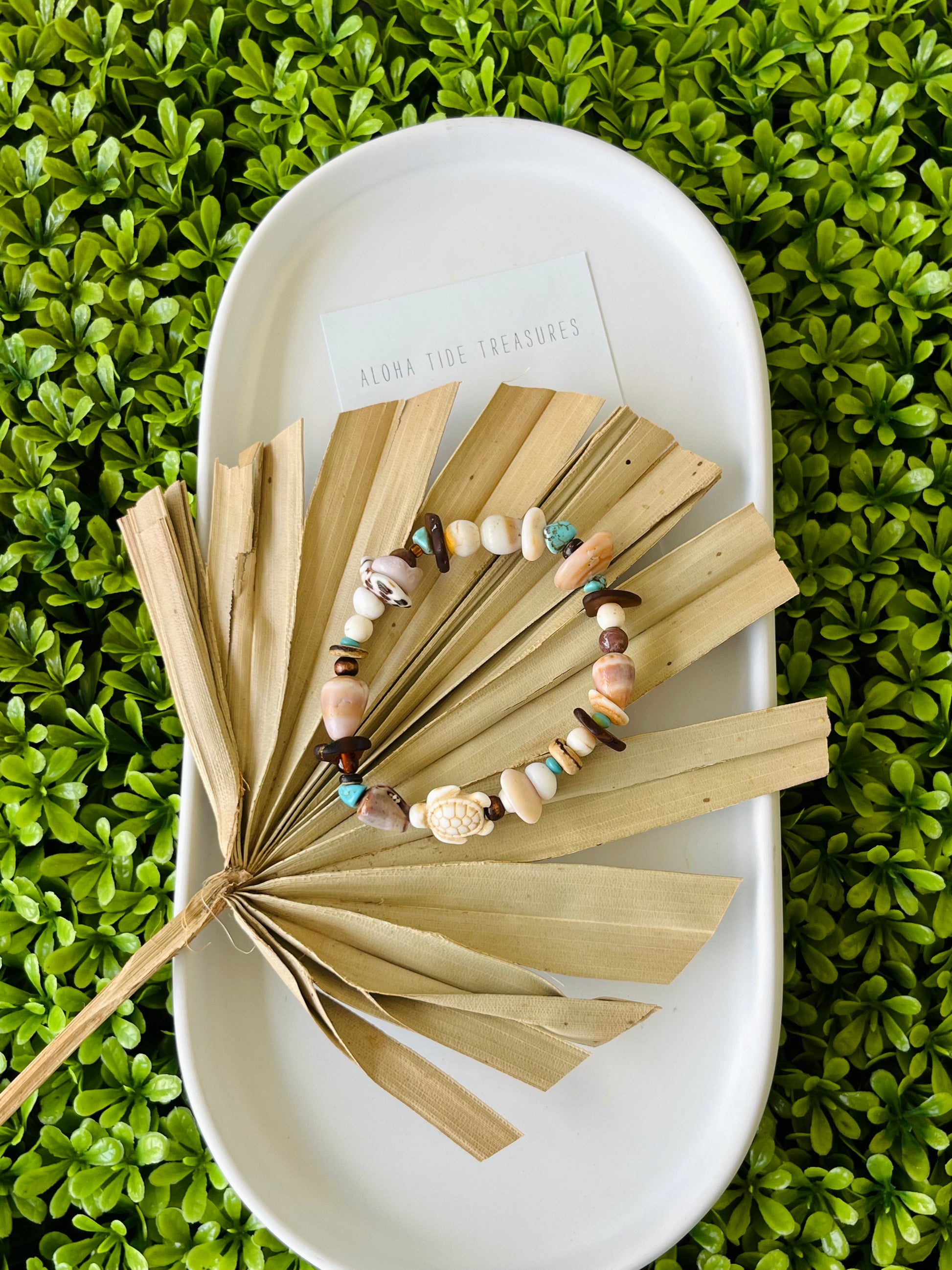 This beautiful bracelet is strung with various pukas, cone shells and brown sea glass. It’s natural with a pop of turquoise!