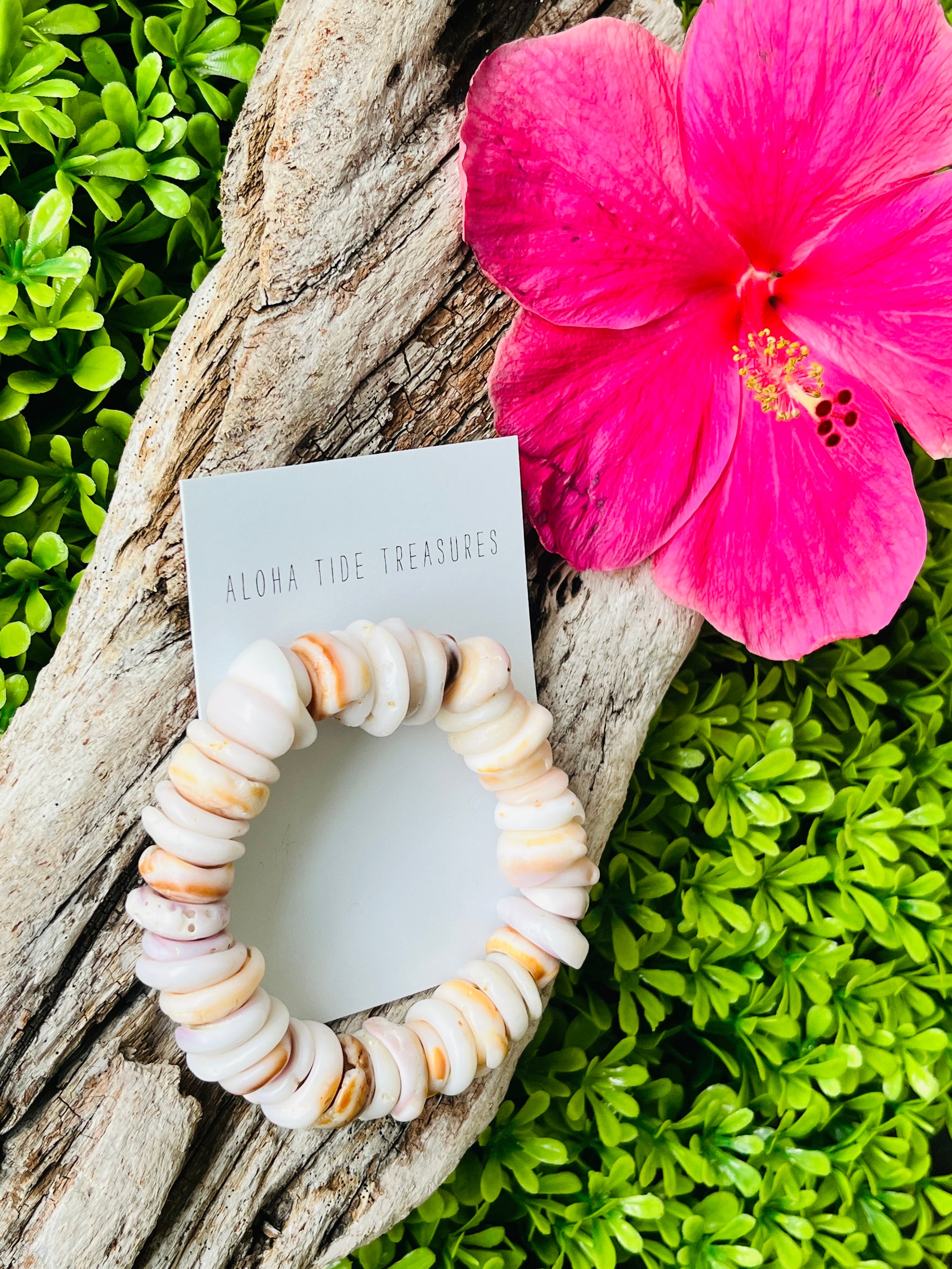 Over 40 White Puka Shells stacked together to create a chunky and beautiful bracelet! Size is Medium.