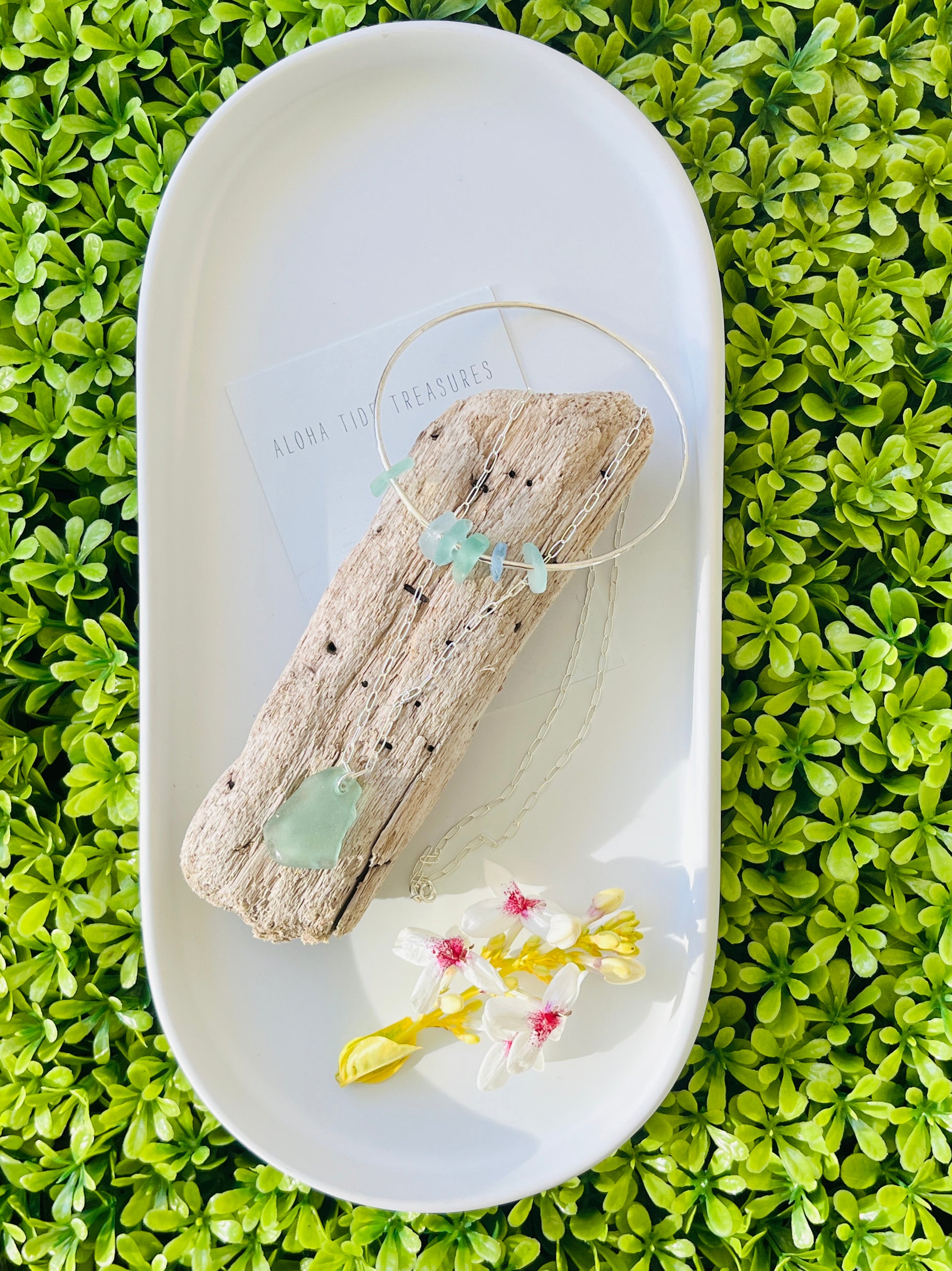 Calling all ocean lovers, this Shades of blue sea glass set is for you! The one of a kind sea glass was found on the beaches of Oahu and hung from a paper clip Sterling silver 20 inch chain and a beautifully hammered Sterling silver bangle.