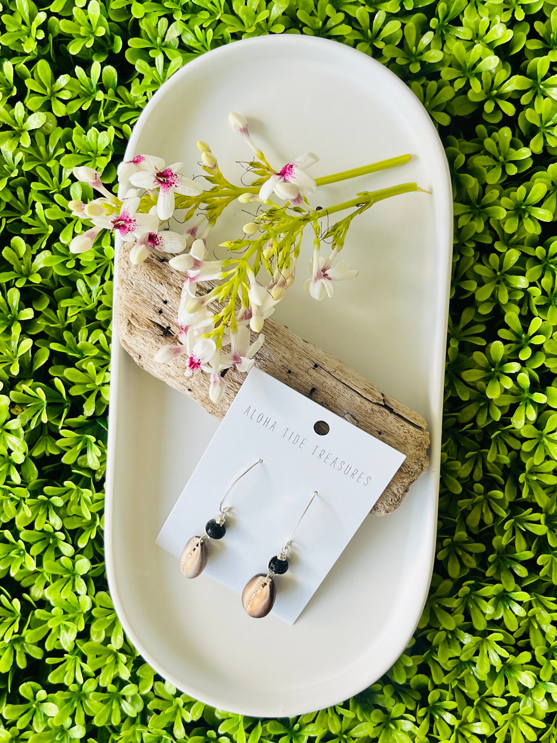 Beautiful pair of locally found Hawaiian Cowrie Shells Hung with a Lava Stone bead on Sterling Silver Earrings!