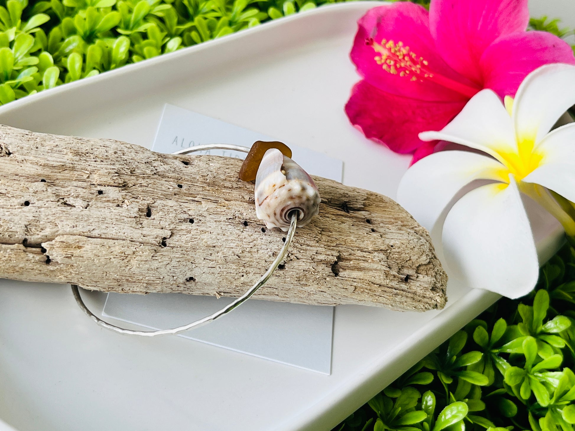 This Sterling Silver bangle that features a beautiful Hawaiian cone shell and sea glass handpicked by me on the island of Oahu, Hawaii.