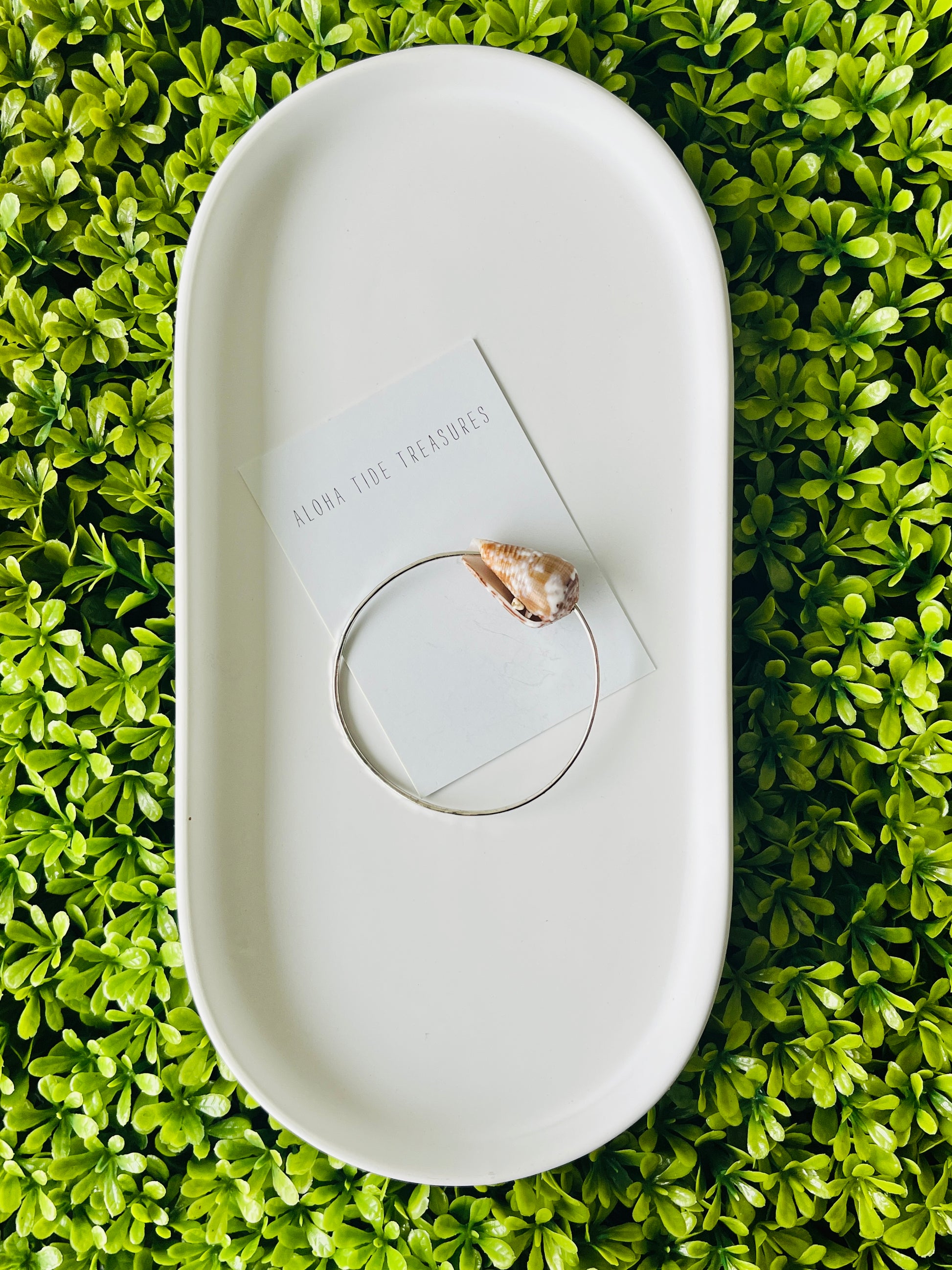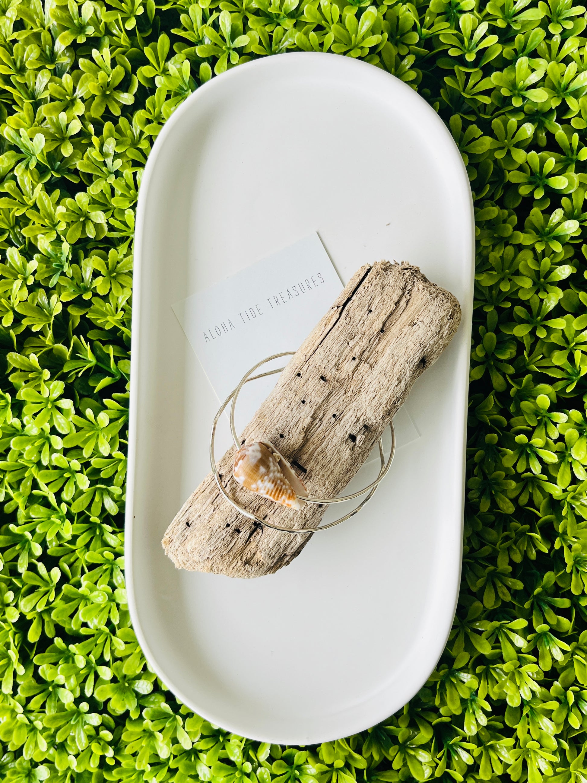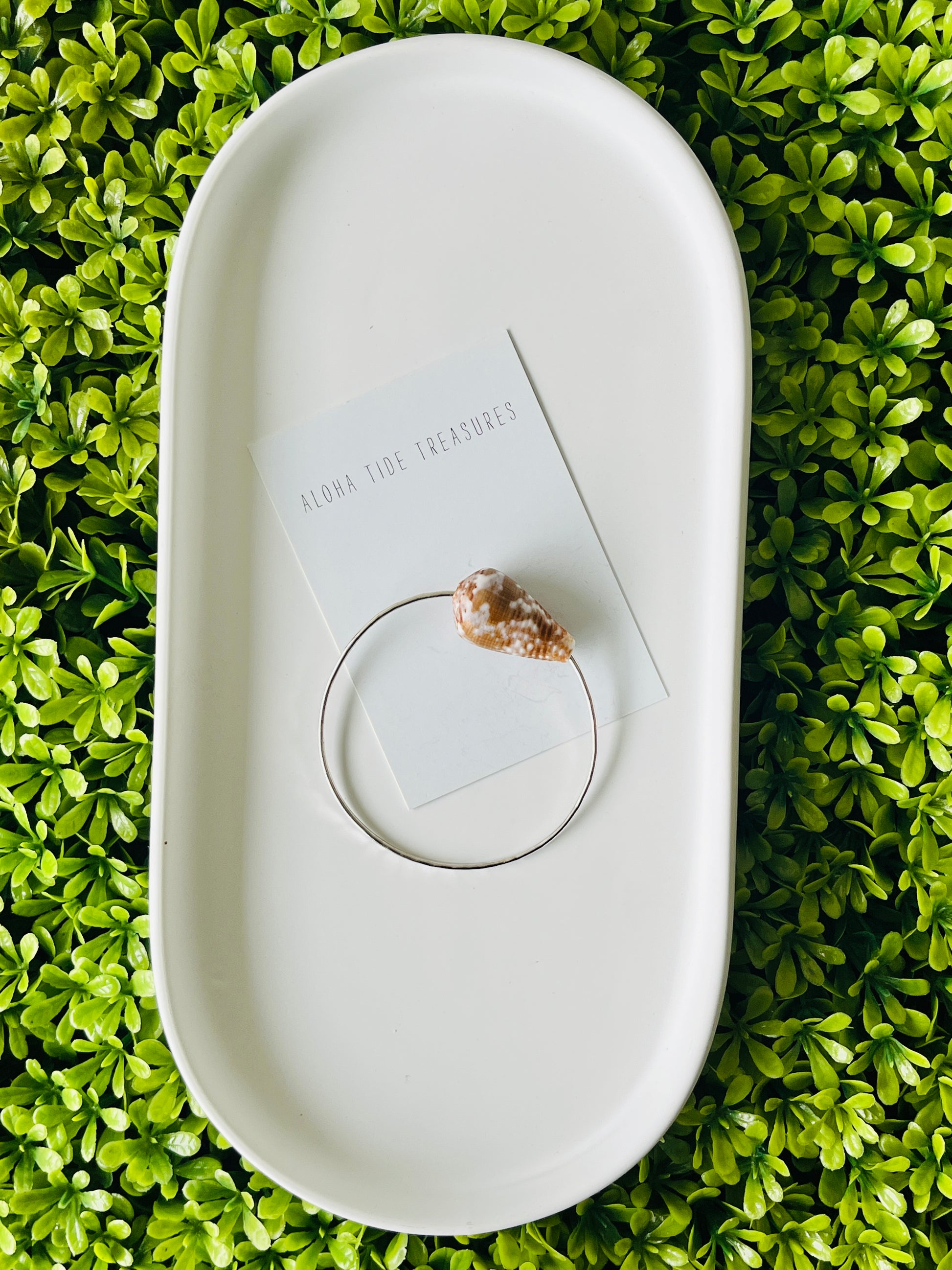 This Sterling Silver bangle features beautiful Hawaiian shells found on the island of Oahu, Hawaii.