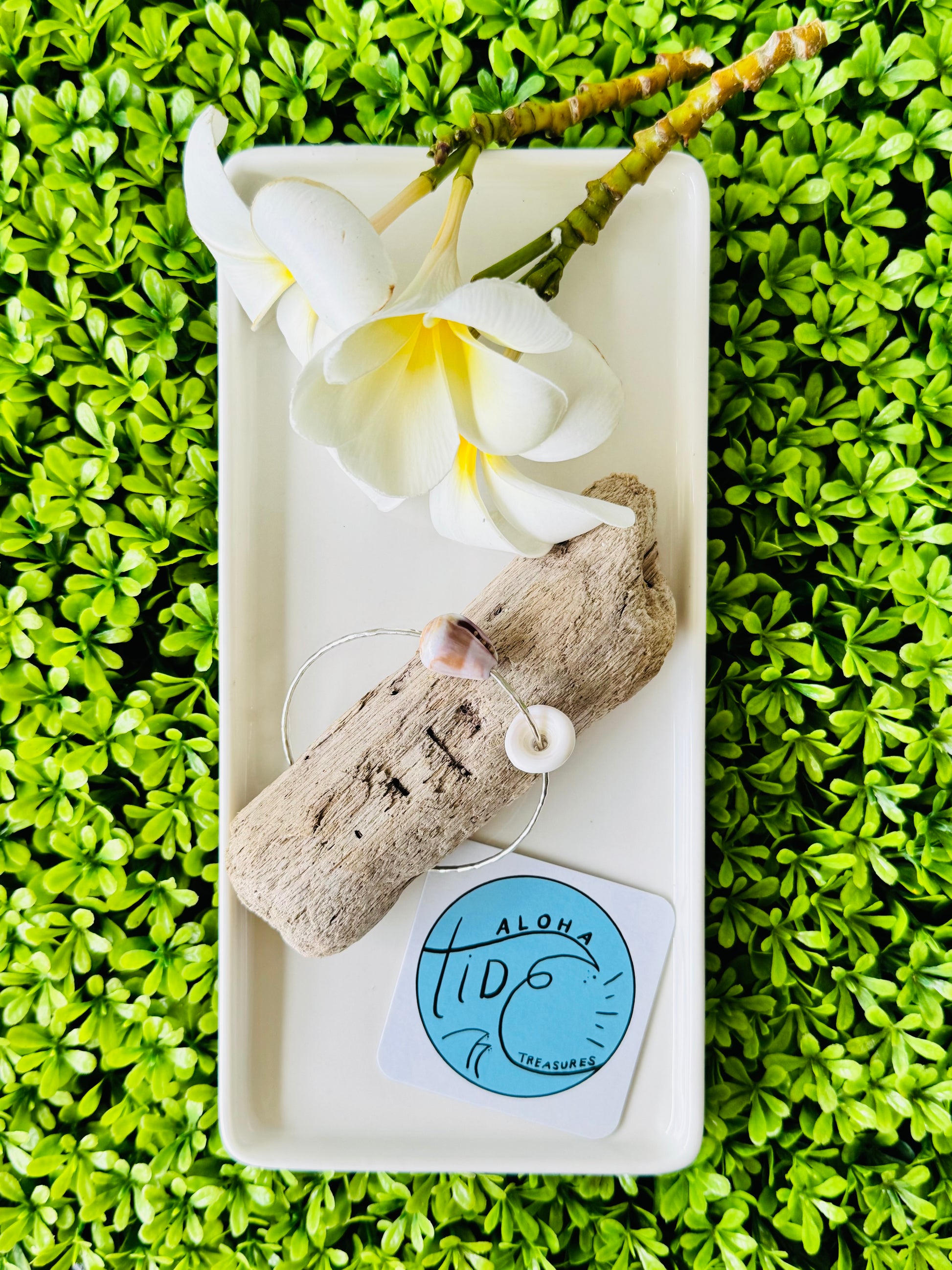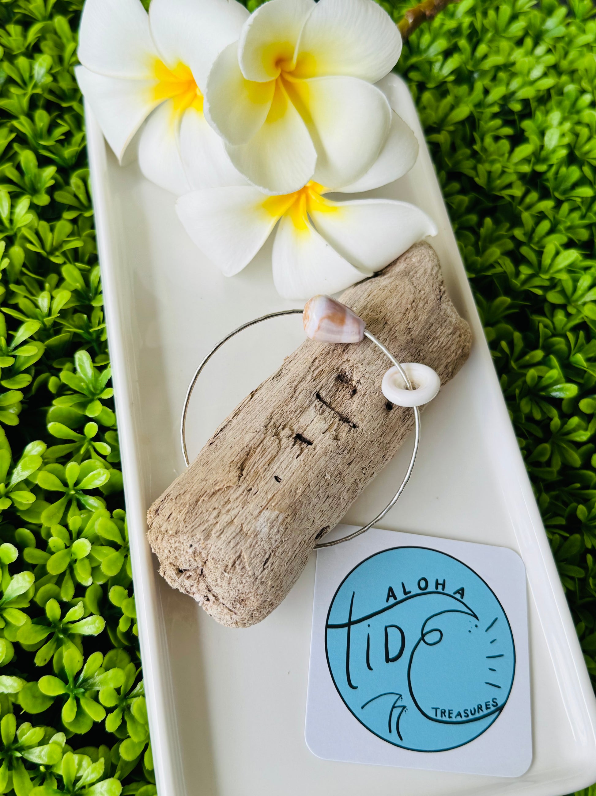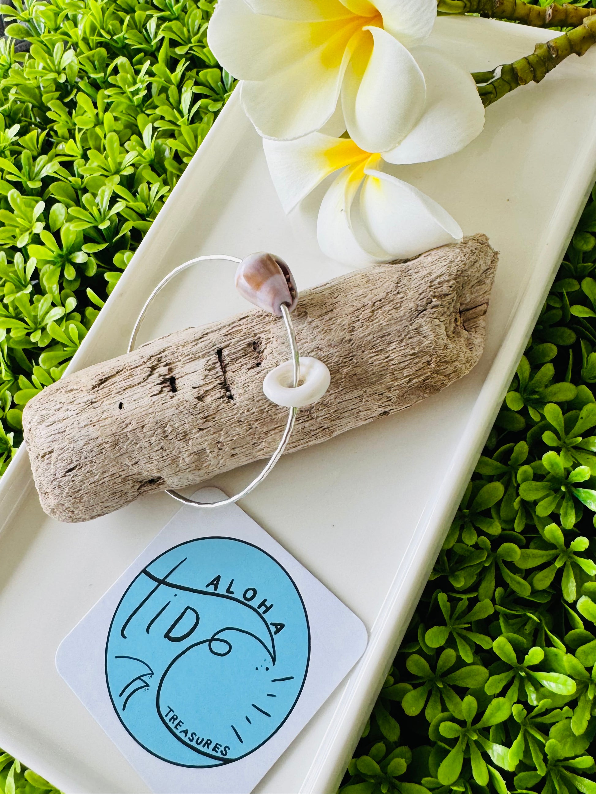 Another beautiful Sterling Silver bangle featuring a Hawaiian Cone Shell and a White Puka Shell measuring 8”!