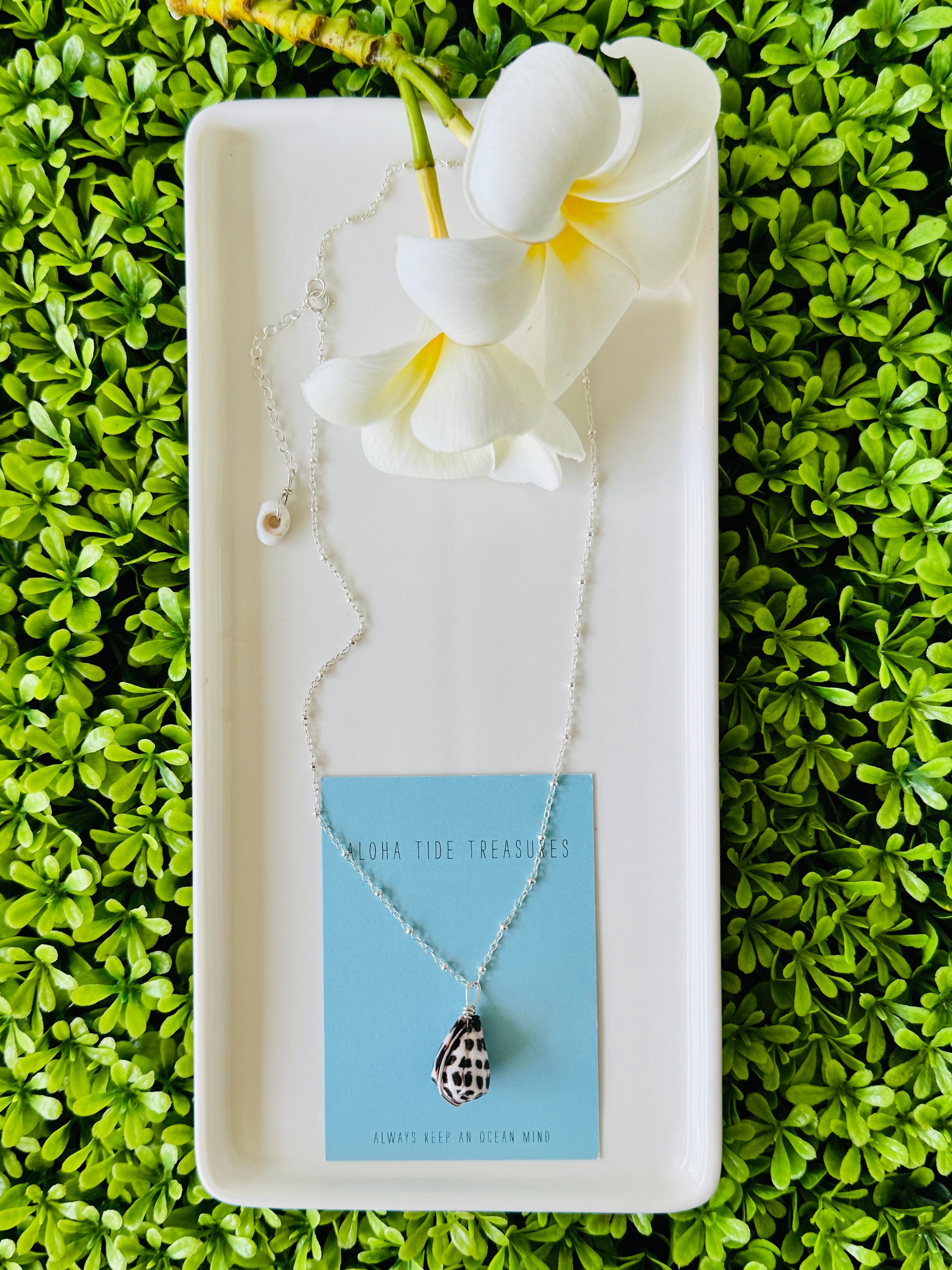 Karla asked us to create this beautiful necklace for her! Here is a dainty Hawaiian Hebrew Shell found locally on Hawaii hung on Sterling Silver Satellite Chain measuring 18” with a 2” extender with Puka shell on the end!