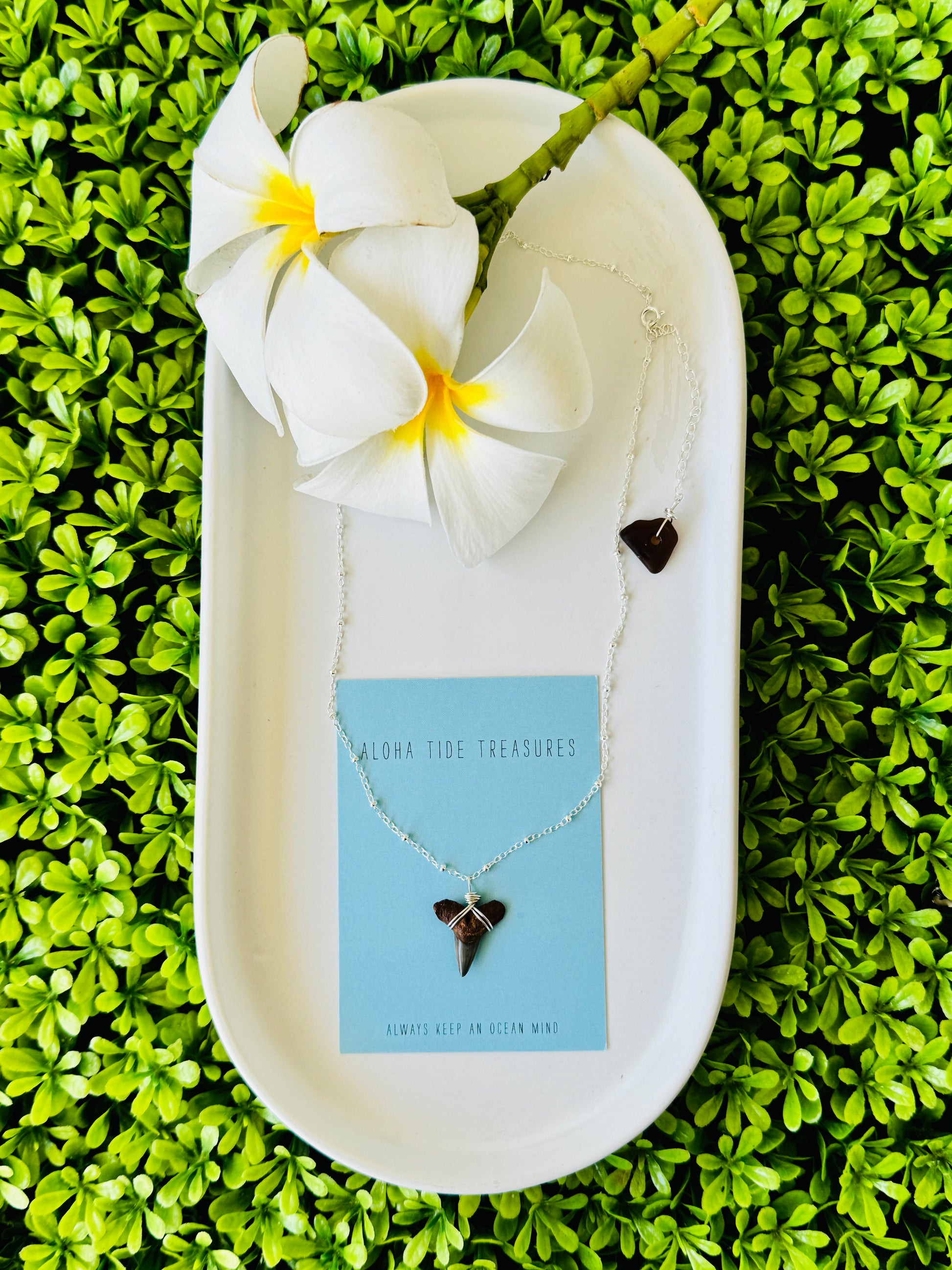 Real Shark Tooth wrapped and hung on Sterling Silver Satellite Chain measuring 16 inches with 2” Extender with Brown sea glass!