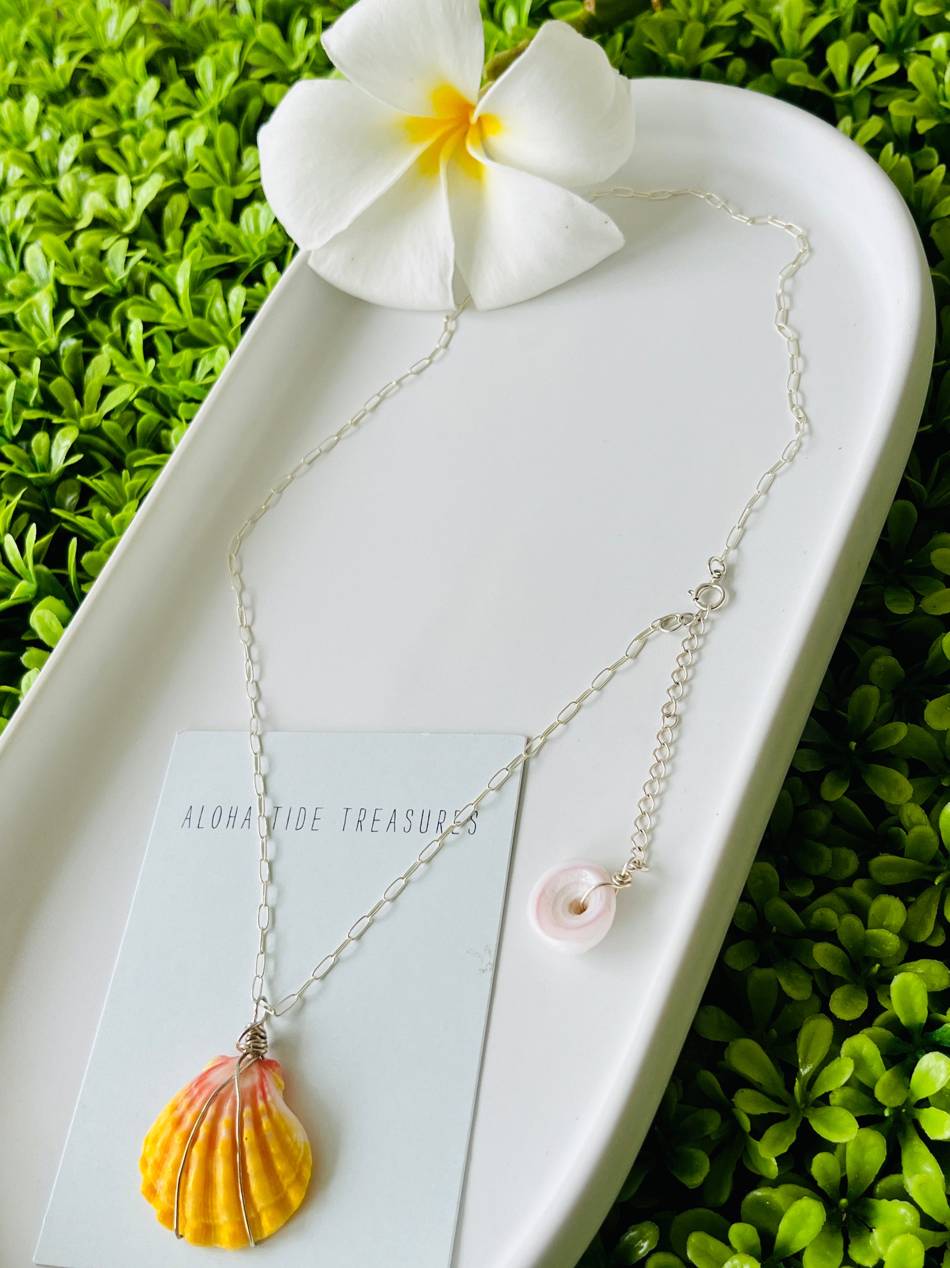 Locally found Hawaiian Sunrise Shell on a 18" Sterling Silver Chain with a 2” extender chain and Puka Shell on the end!